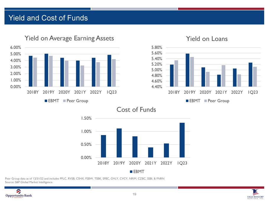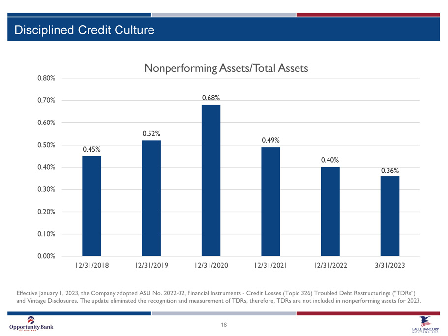 18 0.45% 0.52% 0.68% 0.49% 0.40% 0.36% 0.00% 0.10% 0.20% 0.30% 0.40% 0.50% 0.60% 0.70% 0.80% 12/31/2018 12/31/2019 12/31/2020 12/31/2021 12/31/2022 3/31/2023 Nonperforming Assets/Total Assets Disciplined Credit Culture Effective January 1, 2023, the Company adopted ASU No. 2022 - 02, Financial Instruments - Credit Losses (Topic 326) Troubled Debt Restructurings ("TDRs") and Vintage Disclosures. The update eliminated the recognition and measurement of TDRs, therefore, TDRs are not included in n onp erforming assets for 2023.