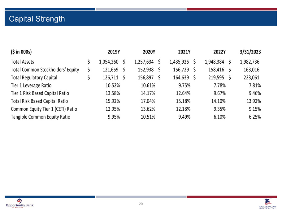 19 Yield and Cost of Funds 0.00% 1.00% 2.00% 3.00% 4.00% 5.00% 6.00% 2018Y 2019Y 2020Y 2021Y 2022Y 1Q23 Yield on Average Earning Assets EBMT Peer Group 4.40% 4.60% 4.80% 5.00% 5.20% 5.40% 5.60% 5.80% 2018Y 2019Y 2020Y 2021Y 2022Y 1Q23 Yield on Loans EBMT Peer Group 0.00% 0.50% 1.00% 1.50% 2018Y 2019Y 2020Y 2021Y 2022Y 1Q23 Cost of Funds EBMT Peer Group data as of 12/31/22 and includes PFLC, RVSB, CSHX, FSBW, TSBK, SFBC, OVLY, CVCY, NRIM, CZBC, SSBI, & FNRN Source: S&P Global Market Intelligence
