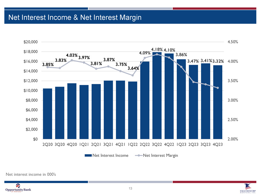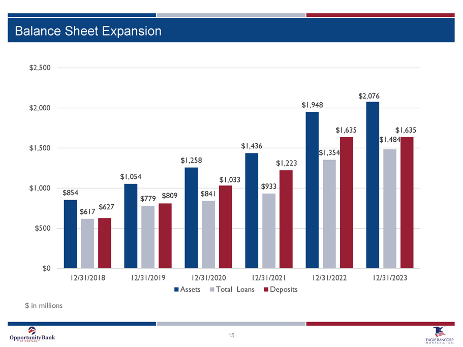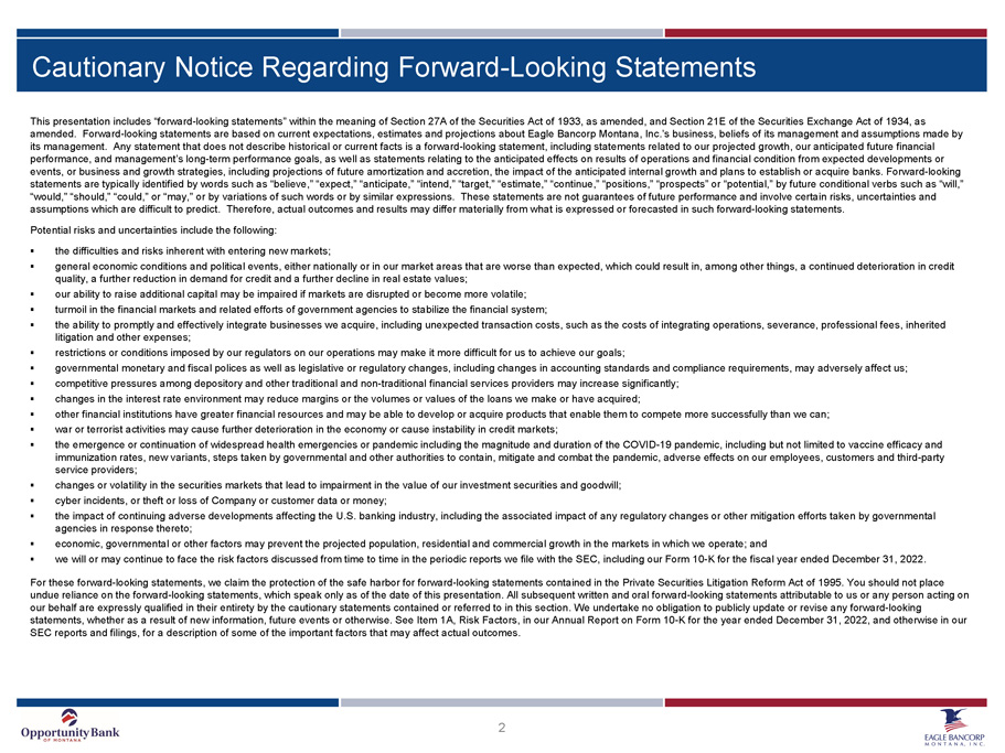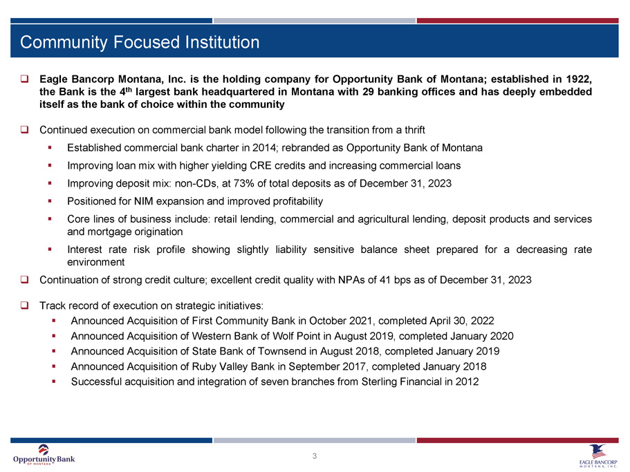 2 Cautionary Notice Regarding Forward - Looking Statements This presentation includes “forward - looking statements” within the meaning of Section 27A of the Securities Act of 1933, as amen ded, and Section 21E of the Securities Exchange Act of 1934, as amended. Forward - looking statements are based on current expectations, estimates and projections about Eagle Bancorp Montana, I nc.’s business, beliefs of its management and assumptions made by its management. Any statement that does not describe historical or current facts is a forward - looking statement, including stat ements related to our projected growth, our anticipated future financial performance, and management’s long - term performance goals, as well as statements relating to the anticipated effects on results of operations and financial condition from expected developments or events, or business and growth strategies, including projections of future amortization and accretion, the impact of the anti cip ated internal growth and plans to establish or acquire banks. Forward - looking statements are typically identified by words such as “believe,” “expect,” “anticipate,” “intend,” “target,” “estimate,” “cont inu e,” “positions,” “prospects” or “potential,” by future conditional verbs such as “will,” “would,” “should,” “could,” or “may,” or by variations of such words or by similar expressions. These statements are not gua ran tees of future performance and involve certain risks, uncertainties and assumptions which are difficult to predict. Therefore, actual outcomes and results may differ materially from what is expres sed or forecasted in such forward - looking statements. Potential risks and uncertainties include the following: ▪ the difficulties and risks inherent with entering new markets; ▪ general economic conditions and political events, either nationally or in our market areas that are worse than expected, whic h c ould result in, among other things, a continued deterioration in credit quality, a further reduction in demand for credit and a further decline in real estate values; ▪ our ability to raise additional capital may be impaired if markets are disrupted or become more volatile; ▪ turmoil in the financial markets and related efforts of government agencies to stabilize the financial system; ▪ the ability to promptly and effectively integrate businesses we acquire, including unexpected transaction costs, such as the cos ts of integrating operations, severance, professional fees, inherited litigation and other expenses; ▪ restrictions or conditions imposed by our regulators on our operations may make it more difficult for us to achieve our goals ; ▪ governmental monetary and fiscal polices as well as legislative or regulatory changes, including changes in accounting standa rds and compliance requirements, may adversely affect us; ▪ competitive pressures among depository and other traditional and non - traditional financial services providers may increase signi ficantly; ▪ changes in the interest rate environment may reduce margins or the volumes or values of the loans we make or have acquired; ▪ other financial institutions have greater financial resources and may be able to develop or acquire products that enable them to compete more successfully than we can; ▪ war or terrorist activities may cause further deterioration in the economy or cause instability in credit markets; ▪ the emergence or continuation of widespread health emergencies or pandemic including the magnitude and duration of the COVID - 19 pandemic, including but not limited to vaccine efficacy and immunization rates, new variants, steps taken by governmental and other authorities to contain, mitigate and combat the pande mic , adverse effects on our employees, customers and third - party service providers; ▪ changes or volatility in the securities markets that lead to impairment in the value of our investment securities and goodwil l; ▪ cyber incidents, or theft or loss of Company or customer data or money; ▪ the impact of continuing adverse developments affecting the U.S. banking industry, including the associated impact of any reg ula tory changes or other mitigation efforts taken by governmental agencies in response thereto; ▪ economic, governmental or other factors may prevent the projected population, residential and commercial growth in the market s i n which we operate; and ▪ we will or may continue to face the risk factors discussed from time to time in the periodic reports we file with the SEC, in clu ding our Form 10 - K for the fiscal year ended December 31, 2022. For these forward - looking statements, we claim the protection of the safe harbor for forward - looking statements contained in the Private Securities Litigation Reform Act of 1995. You should not place undue reliance on the forward - looking statements, which speak only as of the date of this presentation. All subsequent written a nd oral forward - looking statements attributable to us or any person acting on our behalf are expressly qualified in their entirety by the cautionary statements contained or referred to in this section. W e u ndertake no obligation to publicly update or revise any forward - looking statements, whether as a result of new information, future events or otherwise. See Item 1A, Risk Factors, in our Annual Repo rt on Form 10 - K for the year ended December 31, 2022, and otherwise in our SEC reports and filings, for a description of some of the important factors that may affect actual outcomes.