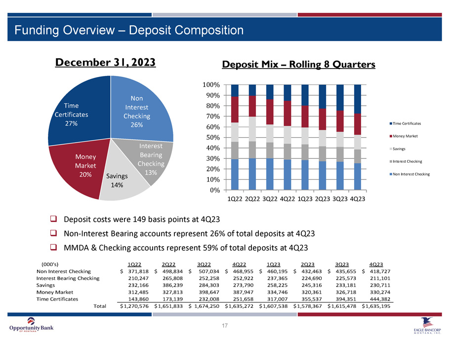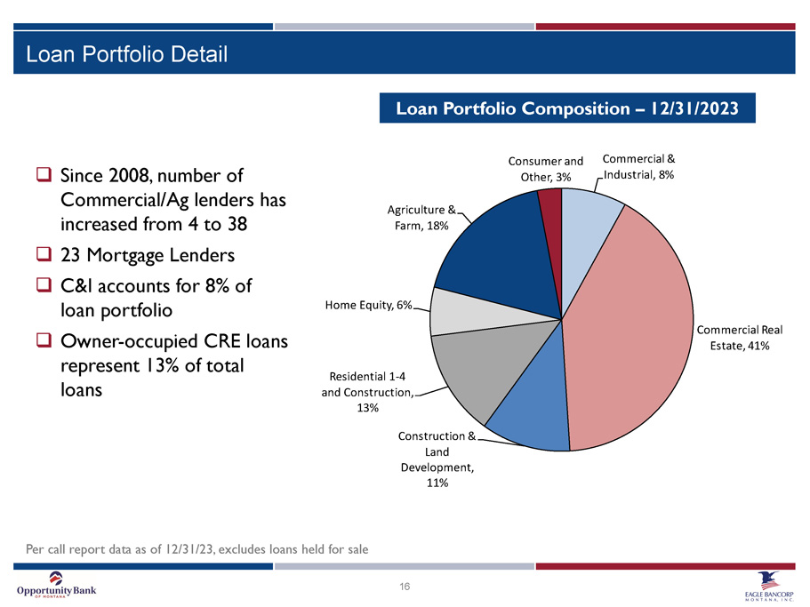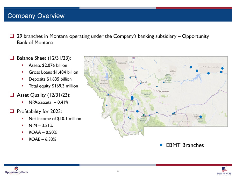 3 □ Eagle Bancorp Montana, Inc . is the holding company for Opportunity Bank of Montana ; established in 1922 , the Bank is the 4 th largest bank headquartered in Montana with 29 banking offices and has deeply embedded itself as the bank of choice within the community □ Continued execution on commercial bank model following the transition from a thrift ▪ Established commercial bank charter in 2014 ; rebranded as Opportunity Bank of Montana ▪ Improving loan mix with higher yielding CRE credits and increasing commercial loans ▪ Improving deposit mix : non - CDs, at 73 % of total deposits as of December 31 , 2023 ▪ Positioned for NIM expansion and improved profitability ▪ Core lines of business include : retail lending, commercial and agricultural lending, deposit products and services and mortgage origination ▪ Interest rate risk profile showing slightly liability sensitive balance sheet prepared for a decreasing rate environment □ Continuation of strong credit culture ; excellent credit quality with NPAs of 41 bps as of December 31 , 2023 □ Track record of execution on strategic initiatives : ▪ Announced Acquisition of First Community Bank in October 2021 , completed April 30 , 2022 ▪ Announced Acquisition of Western Bank of Wolf Point in August 2019 , completed January 2020 ▪ Announced Acquisition of State Bank of Townsend in August 2018 , completed January 2019 ▪ Announced Acquisition of Ruby Valley Bank in September 2017 , completed January 2018 ▪ Successful acquisition and integration of seven branches from Sterling Financial in 2012 Community Focused Institution