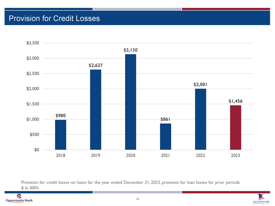 13 Net Interest Income & Net Interest Margin $ 2 , 0 $ 3 , 0 $ 4 , 0 $ 5 , 0 $ 6 , 0 $ 7 , 0 $ 8 , 0 $ 9 , 0 $ 1 0 , 2 . 8 0 3 . 0 0 3 . 2 0 3 . 4 0 3 . 6 0 3 . 8 0 4 . 0 0 4 . 2 0 4 . 4 0 4 . 6 0 Net Interest Income Net Interest Margin 3.85% 3.83% 4.03% 3.97% 3.81% 3.87% 3.75% 3.64% 4.09% 4.18% 4.10% 3.86% 3.47% 3.41% 3.32% 2.00% 2.50% 3.00% 3.50% 4.00% 4.50% $0 $2,000 $4,000 $6,000 $8,000 $10,000 $12,000 $14,000 $16,000 $18,000 $20,000 2Q20 3Q20 4Q20 1Q21 2Q21 3Q21 4Q21 1Q22 2Q22 3Q22 4Q22 1Q23 2Q23 3Q23 4Q23 Net Interest Income Net Interest Margin Net interest income in 000’s