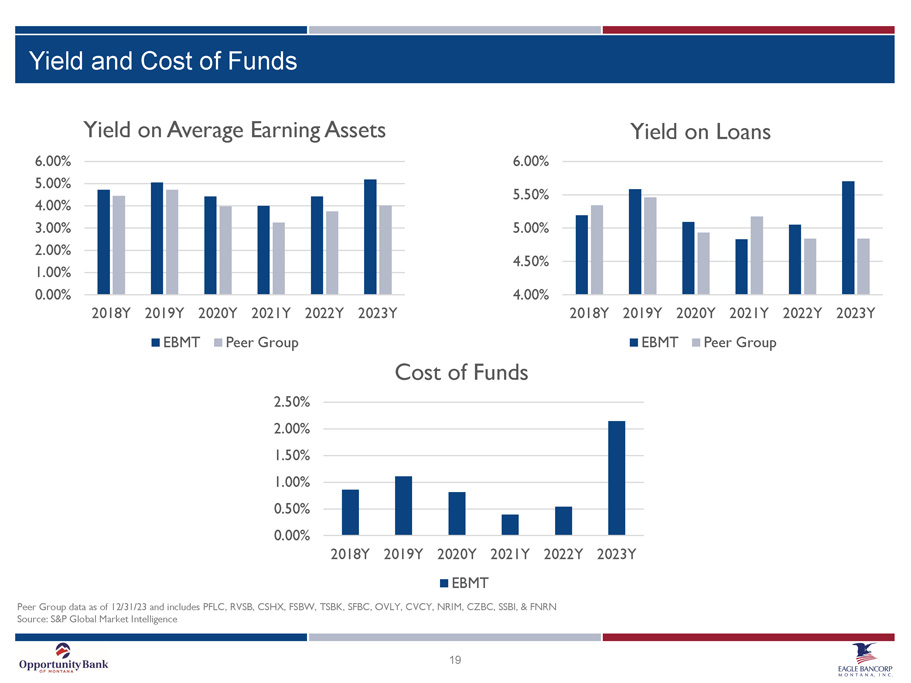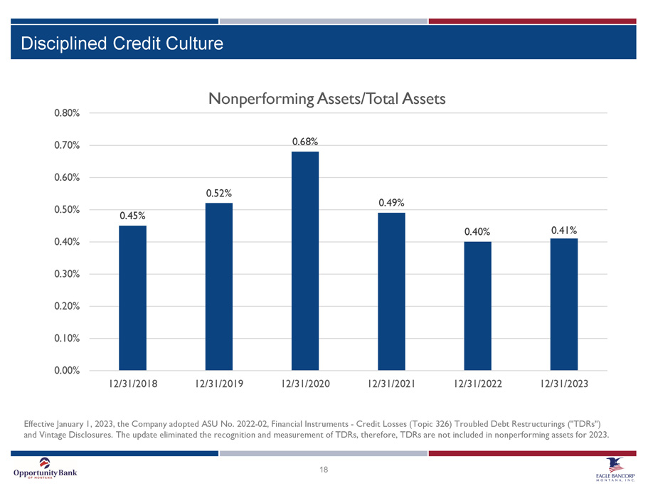 18 0.45% 0.52% 0.68% 0.49% 0.40% 0.41% 0.00% 0.10% 0.20% 0.30% 0.40% 0.50% 0.60% 0.70% 0.80% 12/31/2018 12/31/2019 12/31/2020 12/31/2021 12/31/2022 12/31/2023 Nonperforming Assets/Total Assets Disciplined Credit Culture Effective January 1, 2023, the Company adopted ASU No. 2022 - 02, Financial Instruments - Credit Losses (Topic 326) Troubled Debt Restructurings ("TDRs") and Vintage Disclosures. The update eliminated the recognition and measurement of TDRs, therefore, TDRs are not included in n onp erforming assets for 2023.