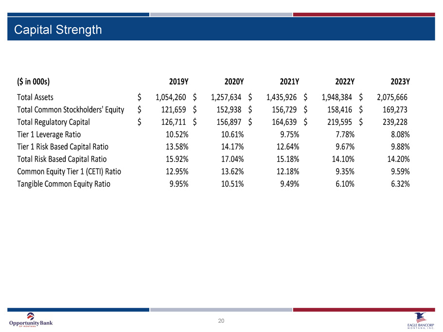 20 Capital Strength Total Assets 1,054,260$ 1,257,634$ 1,435,926$ 1,948,384$ 2,075,666$ Total Common Stockholders' Equity 121,659$ 152,938$ 156,729$ 158,416$ 169,273$ Total Regulatory Capital 126,711$ 156,897$ 164,639$ 219,595$ 239,228$ Tier 1 Leverage Ratio 10.52% 10.61% 9.75% 7.78% 8.08% Tier 1 Risk Based Capital Ratio 13.58% 14.17% 12.64% 9.67% 9.88% Total Risk Based Capital Ratio 15.92% 17.04% 15.18% 14.10% 14.20% Common Equity Tier 1 (CETI) Ratio 12.95% 13.62% 12.18% 9.35% 9.59% Tangible Common Equity Ratio 9.95% 10.51% 9.49% 6.10% 6.32% 2023Y($ in 000s) 2020Y 2021Y 2022Y2019Y