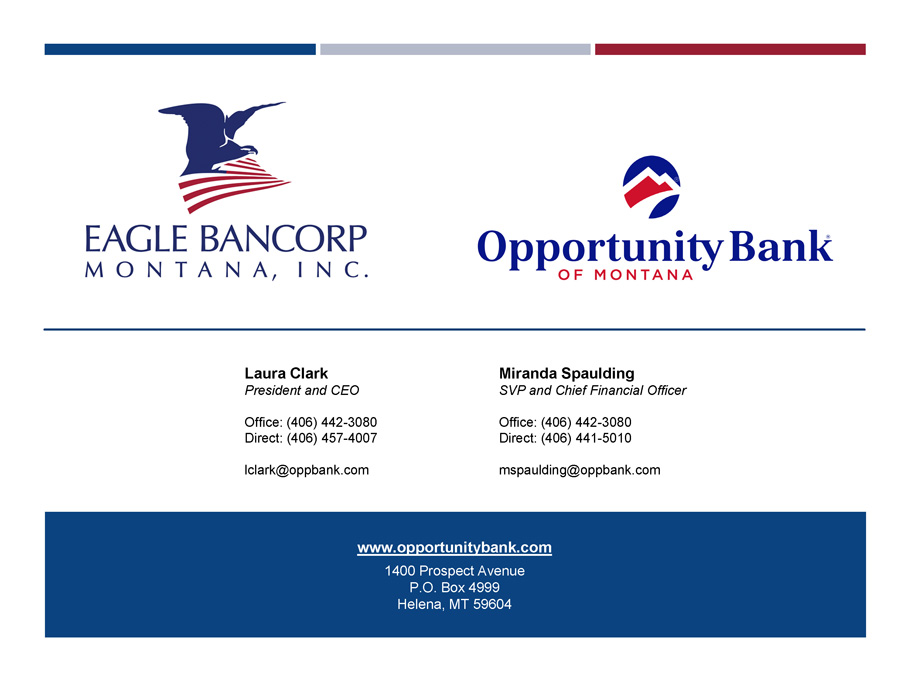 Laura Clark President and CEO Office: (406) 442 - 3080 Direct: (406) 457 - 4007 lclark@oppbank.com www.opportunitybank.com 1400 Prospect Avenue P.O. Box 4999 Helena, MT 59604 Miranda Spaulding SVP and Chief Financial Officer Office: (406) 442 - 3080 Direct: (406) 441 - 5010 mspaulding@oppbank.com