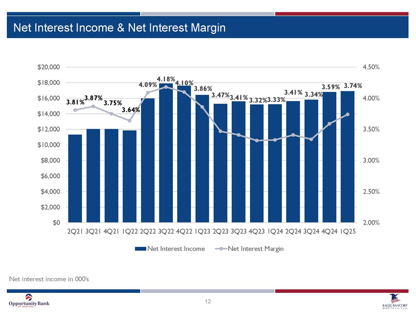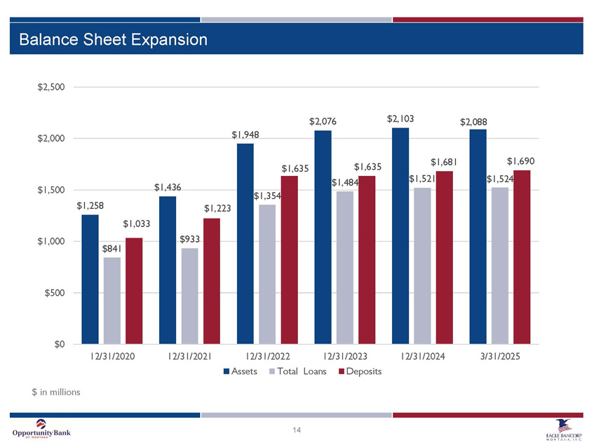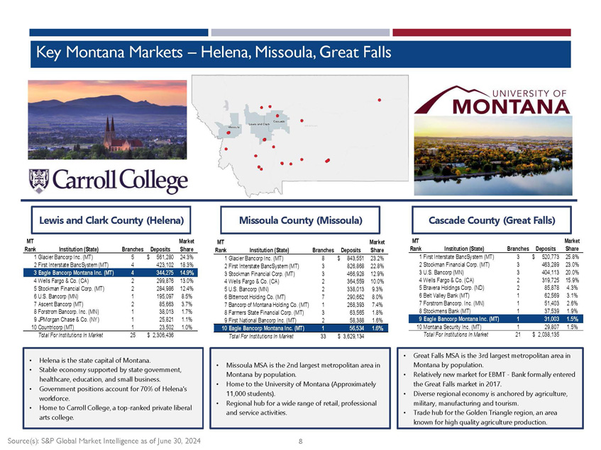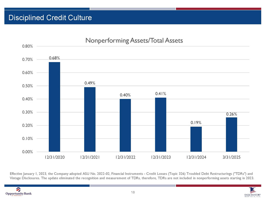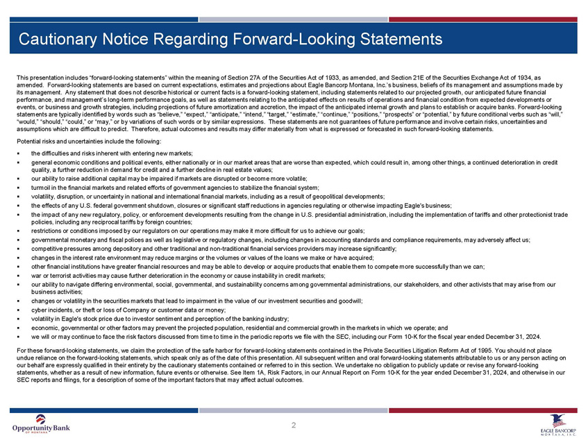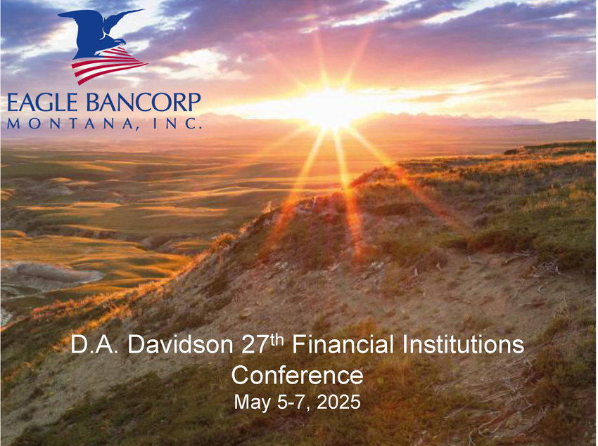 2 Cautionary Notice Regarding Forward - Looking Statements This presentation includes “forward - looking statements” within the meaning of Section 27A of the Securities Act of 1933, as amen ded, and Section 21E of the Securities Exchange Act of 1934, as amended. Forward - looking statements are based on current expectations, estimates and projections about Eagle Bancorp Montana, I nc.’s business, beliefs of its management and assumptions made by its management. Any statement that does not describe historical or current facts is a forward - looking statement, including stat ements related to our projected growth, our anticipated future financial performance, and management’s long - term performance goals, as well as statements relating to the anticipated effects on results of operations and financial condition from expected developments or events, or business and growth strategies, including projections of future amortization and accretion, the impact of the anti cip ated internal growth and plans to establish or acquire banks. Forward - looking statements are typically identified by words such as “believe,” “expect,” “anticipate,” “intend,” “target,” “estimate,” “cont inu e,” “positions,” “prospects” or “potential,” by future conditional verbs such as “will,” “would,” “should,” “could,” or “may,” or by variations of such words or by similar expressions. These statements are not gua ran tees of future performance and involve certain risks, uncertainties and assumptions which are difficult to predict. Therefore, actual outcomes and results may differ materially from what is expres sed or forecasted in such forward - looking statements. Potential risks and uncertainties include the following: ▪ the difficulties and risks inherent with entering new markets; ▪ general economic conditions and political events, either nationally or in our market areas that are worse than expected, whic h c ould result in, among other things, a continued deterioration in credit quality, a further reduction in demand for credit and a further decline in real estate values; ▪ our ability to raise additional capital may be impaired if markets are disrupted or become more volatile; ▪ turmoil in the financial markets and related efforts of government agencies to stabilize the financial system; ▪ volatility , disruption, or uncertainty in national and international financial markets, including as a result of geopolitical developme nts ; ▪ the effects of any U.S. federal government shutdown, closures or significant staff reductions in agencies regulating or other wis e impacting Eagle's business; ▪ the impact of any new regulatory, policy, or enforcement developments resulting from the change in U.S. presidential administ rat ion, including the implementation of tariffs and other protectionist trade policies, including any reciprocal tariffs by foreign countries; ▪ restrictions or conditions imposed by our regulators on our operations may make it more difficult for us to achieve our goals ; ▪ governmental monetary and fiscal polices as well as legislative or regulatory changes, including changes in accounting standa rds and compliance requirements, may adversely affect us; ▪ competitive pressures among depository and other traditional and non - traditional financial services providers may increase signi ficantly; ▪ changes in the interest rate environment may reduce margins or the volumes or values of the loans we make or have acquired; ▪ other financial institutions have greater financial resources and may be able to develop or acquire products that enable them to compete more successfully than we can; ▪ war or terrorist activities may cause further deterioration in the economy or cause instability in credit markets; ▪ our ability to navigate differing environmental, social, governmental, and sustainability concerns among governmental adminis tra tions, our stakeholders, and other activists that may arise from our business activities; ▪ changes or volatility in the securities markets that lead to impairment in the value of our investment securities and goodwil l; ▪ cyber incidents, or theft or loss of Company or customer data or money; ▪ volatility in Eagle's stock price due to investor sentiment and perception of the banking industry; ▪ economic, governmental or other factors may prevent the projected population, residential and commercial growth in the market s i n which we operate; and ▪ we will or may continue to face the risk factors discussed from time to time in the periodic reports we file with the SEC, in clu ding our Form 10 - K for the fiscal year ended December 31, 2024. For these forward - looking statements, we claim the protection of the safe harbor for forward - looking statements contained in the Private Securities Litigation Reform Act of 1995. You should not place undue reliance on the forward - looking statements, which speak only as of the date of this presentation. All subsequent written a nd oral forward - looking statements attributable to us or any person acting on our behalf are expressly qualified in their entirety by the cautionary statements contained or referred to in this section. W e u ndertake no obligation to publicly update or revise any forward - looking statements, whether as a result of new information, future events or otherwise. See Item 1A, Risk Factors, in our Annual Repo rt on Form 10 - K for the year ended December 31, 2024, and otherwise in our SEC reports and filings, for a description of some of the important factors that may affect actual outcomes.