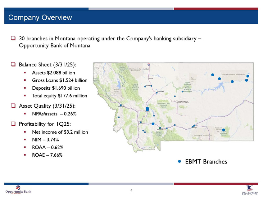 3 □ Eagle Bancorp Montana, Inc . is the holding company for Opportunity Bank of Montana ; established in 1922 , the Bank is the 4 th largest bank headquartered in Montana with 30 banking offices and has deeply embedded itself as the bank of choice within the community □ Continued execution on commercial bank model following the transition from a thrift ▪ Established commercial bank charter in 2014 ; rebranded as Opportunity Bank of Montana ▪ Diversified loan mix with higher yielding agricultural credits and increasing commercial loans ▪ Strong deposit mix : non - CDs, at 73 % of total deposits as of March 31 , 2025 ▪ Positioned for NIM expansion and improved profitability ▪ Core lines of business include : retail lending, commercial and agricultural lending, deposit products and services and mortgage origination ▪ Interest rate risk profile showing slightly liability sensitive balance sheet prepared for a decreasing rate environment □ Continuation of strong credit culture ; excellent credit quality with NPAs of 26 bps as of March 31 , 2025 □ Track record of execution on strategic initiatives : ▪ Announced Acquisition of First Community Bank in October 2021 , completed April 30 , 2022 ▪ Announced Acquisition of Western Bank of Wolf Point in August 2019 , completed January 2020 ▪ Announced Acquisition of State Bank of Townsend in August 2018 , completed January 2019 ▪ Announced Acquisition of Ruby Valley Bank in September 2017 , completed January 2018 ▪ Successful acquisition and integration of seven branches from Sterling Financial in 2012 Community Focused Institution