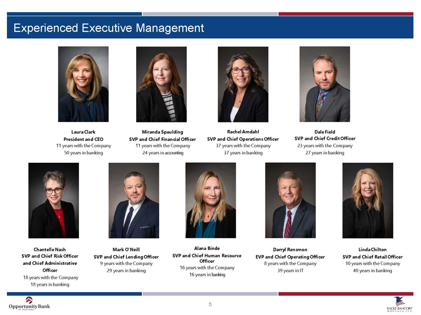 4 Company Overview □ 30 branches in Montana operating under the Company’s banking subsidiary – Opportunity Bank of Montana □ Balance Sheet (3/31/25): ▪ Assets $2.088 billion ▪ Gross Loans $1.524 billion ▪ Deposits $1.690 billion ▪ Total equity $177.6 million □ Asset Quality (3/31/25): ▪ NPAs/assets – 0.26% □ Profitability for 1Q25: ▪ Net income of $3.2 million ▪ NIM – 3.74% ▪ ROAA – 0.62% ▪ ROAE – 7.66% EBMT Branches