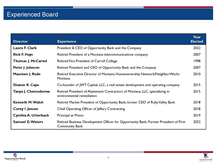 5 Chantelle Nash SVP and Chief Risk Officer and Chief Administrative Officer 1 8 years with the Company 1 8 years in banking Mark O’Neill SVP and Chief Lending Officer 9 years with the Company 2 9 years in banking Darryl Rensmon E VP and Chief Operating Officer 8 years with the Company 39 years in IT Linda Chilton SVP and Chief Retail Officer 10 years with the Company 40 years in banking Alana Binde SVP and Chief Human Resource Officer 16 years with the Company 16 years in banking Laura Clark President and CEO 11 years with the Company 50 years in banking Rachel Amdahl SVP and Chief Operations Officer 3 7 years with the Company 3 7 years in banking Dale Field SVP and Chief Credit Officer 23 years with the Company 2 7 years in banking Miranda Spaulding SVP and Chief Financial Officer 11 years with the Company 24 years in accounting Experienced Executive Management