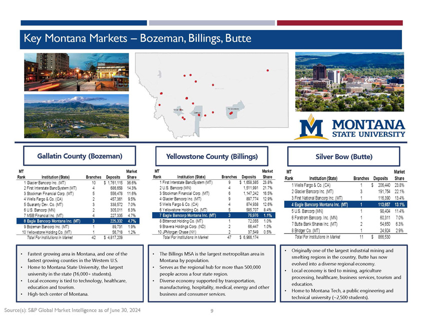 Key Montana Markets – Helena, Missoula, Great Falls Lewis and Clark County (Helena) Cascade County (Great Falls) Missoula County (Missoula) • Helena is the state capital of Montana. • Stable economy supported by state government, healthcare, education, and small business. • Government positions account for 70% of Helena's workforce. • Home to Carroll College, a top - ranked private liberal arts college. • Great Falls MSA is the 3rd largest metropolitan area in Montana by population. • Relatively new market for EBMT - Bank formally entered the Great Falls market in 2017. • Diverse regional economy is anchored by agriculture, military, manufacturing and tourism. • Trade hub for the Golden Triangle region, an area known for high quality agriculture production. • Missoula MSA is the 2nd largest metropolitan area in Montana by population. • Home to the University of Montana (Approximately 11,000 students). • Regional hub for a wide range of retail, professional and service activities. Source(s): S&P Global Market Intelligence as of June 30, 2024 8 MT Rank Institution (State) Branches Deposits Market Share 1Glacier Bancorp Inc. (MT) 5 561,280$ 24.3% 2First Interstate BancSystem (MT) 4 423,102 18.3% 3Eagle Bancorp Montana Inc. (MT) 4 344,275 14.9% 4Wells Fargo & Co. (CA) 2 299,876 13.0% 5Stockman Financial Corp. (MT) 2 284,986 12.4% 6U.S. Bancorp (MN) 1 195,097 8.5% 7Ascent Bancorp (MT) 2 85,663 3.7% 8Forstrom Bancorp. Inc. (MN) 1 38,013 1.7% 9JPMorgan Chase & Co. (NY) 1 25,821 1.1% 10Countricorp (MT) 1 23,502 1.0% Total For Institutions In Market 25 2,306,436$ MT Rank Institution (State) Branches Deposits Market Share 1Glacier Bancorp Inc. (MT) 8 843,551$ 23.2% 2First Interstate BancSystem (MT) 3 826,868 22.8% 3Stockman Financial Corp. (MT) 3 466,928 12.9% 4Wells Fargo & Co. (CA) 2 364,559 10.0% 5U.S. Bancorp (MN) 2 338,013 9.3% 6Bitterroot Holding Co. (MT) 7 290,662 8.0% 7Bancorp of Montana Holding Co. (MT) 1 268,393 7.4% 8Farmers State Financial Corp. (MT) 3 63,565 1.8% 9First National Bancorp Inc. (MT) 2 58,388 1.6% 10Eagle Bancorp Montana Inc. (MT) 1 56,534 1.6% Total For Institutions In Market 33 3,629,134$ MT Rank Institution (State) Branches Deposits Market Share 1First Interstate BancSystem (MT) 3 520,773$ 25.8% 2Stockman Financial Corp. (MT) 3 463,289 23.0% 3U.S. Bancorp (MN) 3 404,113 20.0% 4Wells Fargo & Co. (CA) 2 319,725 15.9% 5Bravera Holdings Corp. (ND) 2 85,878 4.3% 6Belt Valley Bank (MT) 1 62,569 3.1% 7Forstrom Bancorp. Inc. (MN) 1 51,403 2.6% 8Stockmens Bank (MT) 1 37,539 1.9% 9Eagle Bancorp Montana Inc. (MT) 1 31,003 1.5% 10Montana Security Inc. (MT) 1 29,807 1.5% Total For Institutions In Market 21 2,038,135$