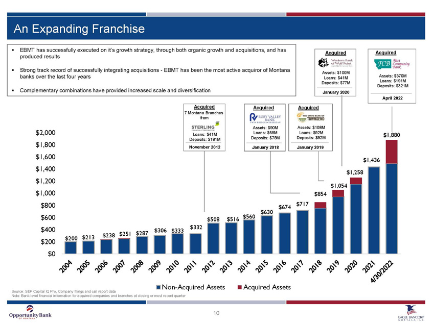 Key Montana Markets – Bozeman, Billings, Butte Gallatin County (Bozeman) Silver Bow (Butte) Yellowstone County (Billings) • Fastest growing area in Montana, and one of the fastest growing counties in the Western U.S. • Home to Montana State University, the largest university in the state (16,000+ students). • Local economy is tied to technology, healthcare, education and tourism. • High - tech center of Montana. • Originally one of the largest industrial mining and smelting regions in the country, Butte has now evolved into a diverse regional economy. • Local economy is tied to mining, agriculture processing, healthcare, business services, tourism and education. • Home to Montana Tech, a public engineering and technical university (~2,500 students). • The Billings MSA is the largest metropolitan area in Montana by population. • Serves as the regional hub for more than 500,000 people across a four state region. • Diverse economy supported by transportation, manufacturing, hospitality, medical, energy and other business and consumer services. Source(s): S&P Global Market Intelligence as of June 30, 2024 9 MT Rank Institution (State) Branches Deposits Market Share 1Glacier Bancorp Inc. (MT) 10 1,761,115$ 36.6% 2First Interstate BancSystem (MT) 4 686,658 14.3% 3Stockman Financial Corp. (MT) 5 556,478 11.6% 4Wells Fargo & Co. (CA) 2 457,361 9.5% 5Guaranty Dev. Co. (MT) 3 338,572 7.0% 6U.S. Bancorp (MN) 2 305,011 6.3% 7MSB Financial Inc. (MT) 4 227,335 4.7% 8Eagle Bancorp Montana Inc. (MT) 3 225,332 4.7% 9Bozeman Bancorp Inc. (MT) 1 89,731 1.9% 10Yellowstone Holding Co. (MT) 1 56,718 1.2% Total For Institutions In Market 42 4,817,209$ MT Rank Institution (State) Branches Deposits Market Share 1Wells Fargo & Co. (CA) 1 206,440$ 23.8% 2Glacier Bancorp Inc. (MT) 3 191,754 22.1% 3First National Bancorp Inc. (MT) 1 116,390 13.4% 4Eagle Bancorp Montana Inc. (MT) 1 113,657 13.1% 5U.S. Bancorp (MN) 1 98,404 11.4% 6Forstrom Bancorp. Inc. (MN) 1 60,311 7.0% 7Butte Bank Shares Inc. (MT) 2 54,650 6.3% 8Bridger Co. (MT) 1 24,924 2.9% Total For Institutions In Market 11 866,530$ MT Rank Institution (State) Branches Deposits Market Share 1First Interstate BancSystem (MT) 9 1,658,385$ 23.8% 2U.S. Bancorp (MN) 4 1,511,991 21.7% 3Stockman Financial Corp. (MT) 6 1,147,242 16.5% 4Glacier Bancorp Inc. (MT) 9 897,774 12.9% 5Wells Fargo & Co. (CA) 4 874,938 12.6% 6Yellowstone Holding Co. (MT) 5 585,707 8.4% 7Eagle Bancorp Montana Inc. (MT) 3 76,976 1.1% 8Bitterroot Holding Co. (MT) 1 72,055 1.0% 9Bravera Holdings Corp. (ND) 2 66,447 1.0% 10JPMorgan Chase (NY) 2 37,549 0.5% Total For Institutions In Market 47 6,966,174$