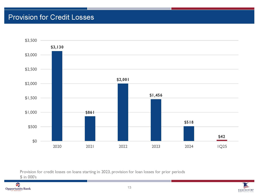 12 Net Interest Income & Net Interest Margin $ 2 , 0 $ 3 , 0 $ 4 , 0 $ 5 , 0 $ 6 , 0 $ 7 , 0 $ 8 , 0 $ 9 , 0 $ 1 0 , 2 . 8 0 3 . 0 0 3 . 2 0 3 . 4 0 3 . 6 0 3 . 8 0 4 . 0 0 4 . 2 0 4 . 4 0 4 . 6 0 Net Interest Income Net Interest Margin 3.81% 3.87% 3.75% 3.64% 4.09% 4.18% 4.10% 3.86% 3.47% 3.41% 3.32% 3.33% 3.41% 3.34% 3.59% 3.74% 2.00% 2.50% 3.00% 3.50% 4.00% 4.50% $0 $2,000 $4,000 $6,000 $8,000 $10,000 $12,000 $14,000 $16,000 $18,000 $20,000 2Q21 3Q21 4Q21 1Q22 2Q22 3Q22 4Q22 1Q23 2Q23 3Q23 4Q23 1Q24 2Q24 3Q24 4Q24 1Q25 Net Interest Income Net Interest Margin Net interest income in 000’s
