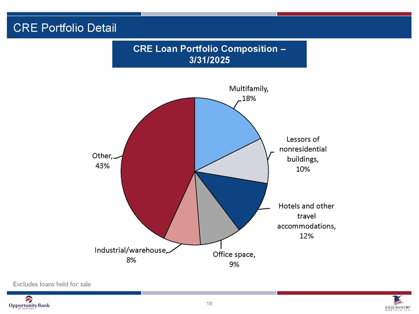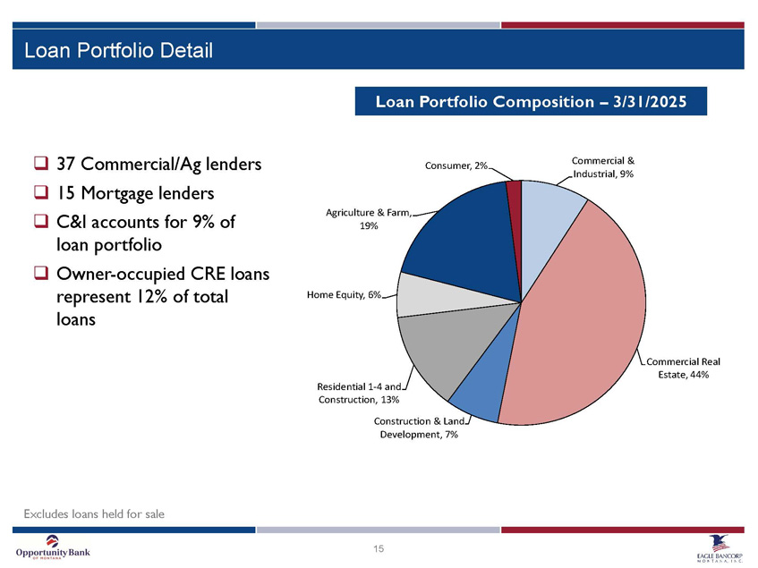 15 Commercial & Industrial , 9% Commercial Real Estate , 44% Construction & Land Development , 7% Residential 1 - 4 and Construction , 13% Home Equity , 6% Agriculture & Farm , 19% Consumer , 2% Loan Portfolio Composition – 3/31/2025 □ 37 Commercial/Ag lenders □ 15 Mortgage lenders □ C&I accounts for 9% of loan portfolio □ Owner - occupied CRE loans represent 12% of total loans Excludes loans held for sale Loan Portfolio Detail