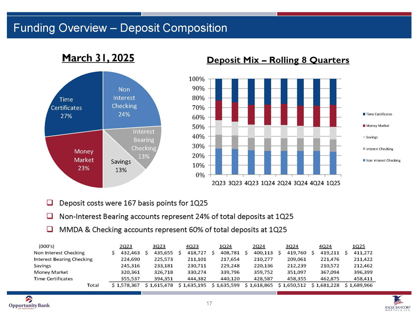 17 Non Interest Checking 24% Interest Bearing Checking 13% Savings 13% Money Market 23% Time Certificates 27% 0% 10% 20% 30% 40% 50% 60% 70% 80% 90% 100% 2Q23 3Q23 4Q23 1Q24 2Q24 3Q24 4Q24 1Q25 Time Certificates Money Market Savings Interest Checking Non Interest Checking March 31, 2025 Deposit Mix – Rolling 8 Quarters □ Deposit costs were 167 basis points for 1Q25 □ Non - Interest Bearing accounts represent 24% of total deposits at 1Q25 □ MMDA & Checking accounts represent 60% of total deposits at 1Q25 (000's) 2Q23 3Q23 4Q23 1Q24 2Q24 3Q24 4Q24 1Q25 Non Interest Checking 432,463$ 435,655$ 418,727$ 408,781$ 400,113$ 419,760$ 419,211$ 411,272$ Interest Bearing Checking 224,690 225,573 211,101 217,654 210,277 209,061 221,476 211,422 Savings 245,316 233,181 230,711 229,248 220,136 212,239 210,572 212,462 Money Market 320,361 326,718 330,274 339,796 359,752 351,097 367,094 396,399 Time Certificates 355,537 394,351 444,382 440,120 428,587 458,355 462,875 458,411 Total 1,578,367$ 1,615,478$ 1,635,195$ 1,635,599$ 1,618,865$ 1,650,512$ 1,681,228$ 1,689,966$ Funding Overview – Deposit Composition