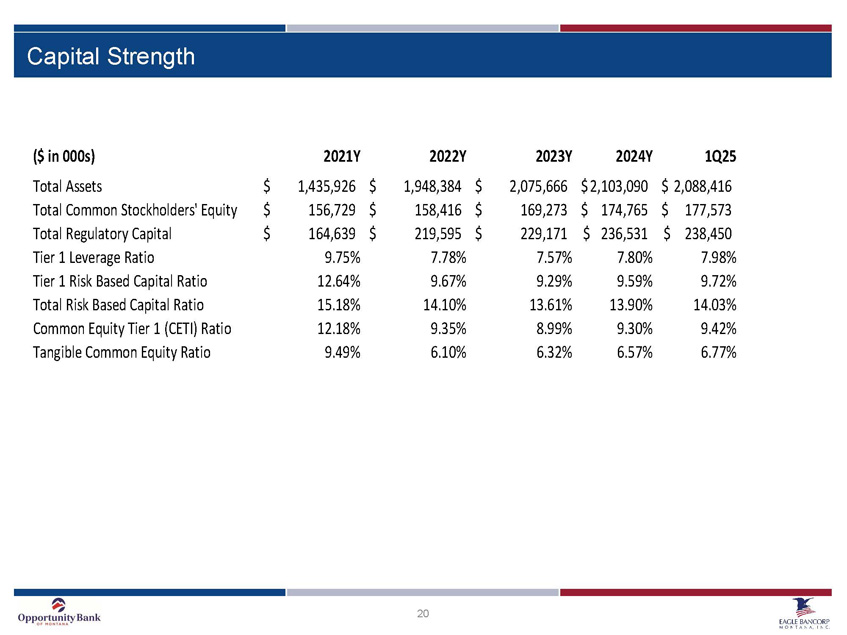 19 Yield and Cost of Funds 0.00% 2.00% 4.00% 6.00% 8.00% 2020Y 2021Y 2022Y 2023Y 2024Y 1Q25 Yield on Average Earning Assets EBMT Peer Group 0.00% 2.00% 4.00% 6.00% 8.00% 2020Y 2021Y 2022Y 2023Y 2024Y 1Q25 Yield on Loans EBMT Peer Group 0.00% 0.50% 1.00% 1.50% 2.00% 2.50% 3.00% 2020Y 2021Y 2022Y 2023Y 2024Y 1Q25 Cost of Funds EBMT *Peer Group data as of the quarter ended December 31, 2024. Peer group includes PFLC, RVSB, CSHX, FSBW, TSBK, SFBC, OVLY, NRI M, CZBC, SSBI & FNRN. Source: S&P Global Market Intelligence * *