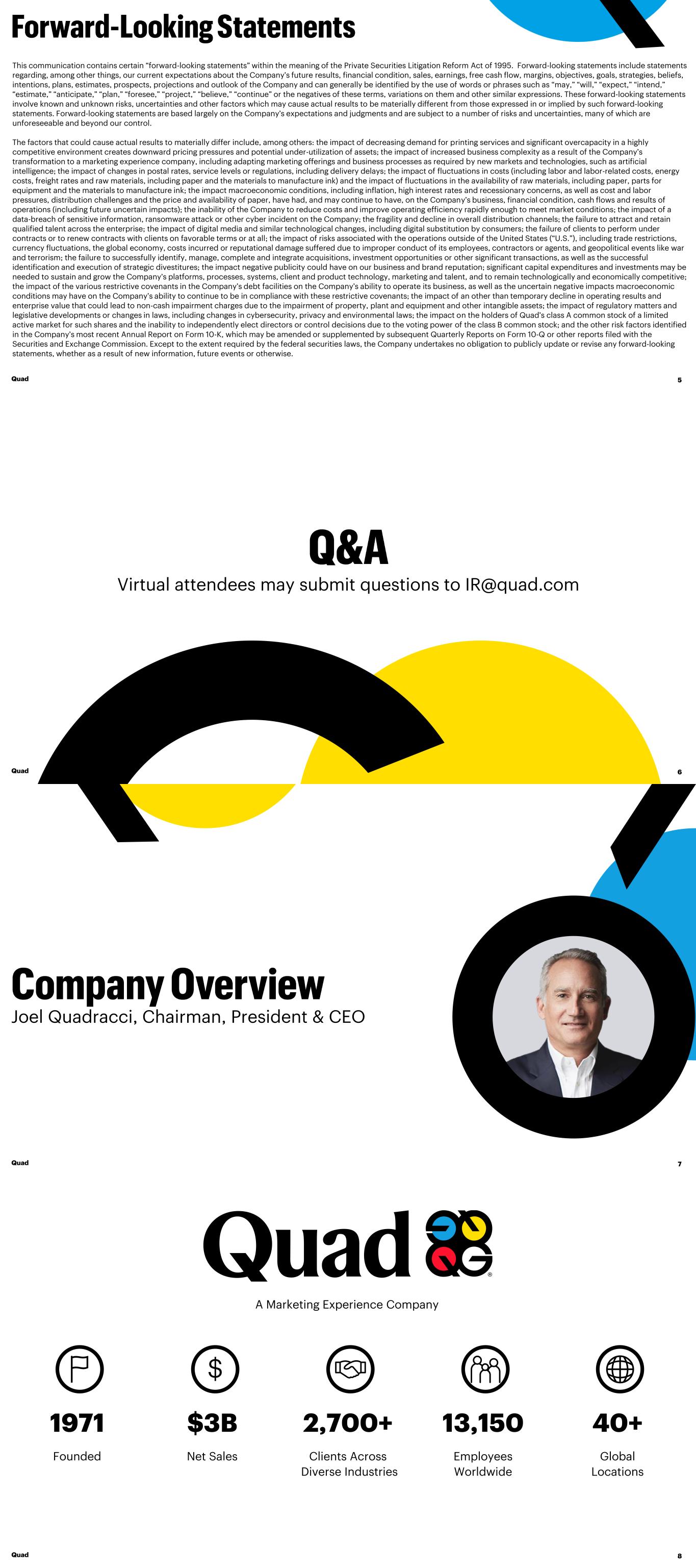 This communication contains certain “forward-looking statements” within the meaning of the Private Securities Litigation Reform Act of 1995. Forward-looking statements include statements regarding, among other things, our current expectations about the Company’s future results, financial condition, sales, earnings, free cash flow, margins, objectives, goals, strategies, beliefs, intentions, plans, estimates, prospects, projections and outlook of the Company and can generally be identified by the use of words or phrases such as “may,” “will,” “expect,” “intend,” “estimate,” “anticipate,” “plan,” “foresee,” “project,” “believe,” “continue” or the negatives of these terms, variations on them and other similar expressions. These forward-looking statements involve known and unknown risks, uncertainties and other factors which may cause actual results to be materially different from those expressed in or implied by such forward-looking statements. Forward-looking statements are based largely on the Company’s expectations and judgments and are subject to a number of risks and uncertainties, many of which are unforeseeable and beyond our control. The factors that could cause actual results to materially differ include, among others: the impact of decreasing demand for printing services and significant overcapacity in a highly competitive environment creates downward pricing pressures and potential under-utilization of assets; the impact of increased business complexity as a result of the Company’s transformation to a marketing experience company, including adapting marketing offerings and business processes as required by new markets and technologies, such as artificial intelligence; the impact of changes in postal rates, service levels or regulations, including delivery delays; the impact of fluctuations in costs (including labor and labor-related costs, energy costs, freight rates and raw materials, including paper and the materials to manufacture ink) and the impact of fluctuations in the availability of raw materials, including paper, parts for equipment and the materials to manufacture ink; the impact macroeconomic conditions, including inflation, high interest rates and recessionary concerns, as well as cost and labor pressures, distribution challenges and the price and availability of paper, have had, and may continue to have, on the Company’s business, financial condition, cash flows and results of operations (including future uncertain impacts); the inability of the Company to reduce costs and improve operating efficiency rapidly enough to meet market conditions; the impact of a data-breach of sensitive information, ransomware attack or other cyber incident on the Company; the fragility and decline in overall distribution channels; the failure to attract and retain qualified talent across the enterprise; the impact of digital media and similar technological changes, including digital substitution by consumers; the failure of clients to perform under contracts or to renew contracts with clients on favorable terms or at all; the impact of risks associated with the operations outside of the United States (“U.S.”), including trade restrictions, currency fluctuations, the global economy, costs incurred or reputational damage suffered due to improper conduct of its employees, contractors or agents, and geopolitical events like war and terrorism; the failure to successfully identify, manage, complete and integrate acquisitions, investment opportunities or other significant transactions, as well as the successful identification and execution of strategic divestitures; the impact negative publicity could have on our business and brand reputation; significant capital expenditures and investments may be needed to sustain and grow the Company’s platforms, processes, systems, client and product technology, marketing and talent, and to remain technologically and economically competitive; the impact of the various restrictive covenants in the Company’s debt facilities on the Company’s ability to operate its business, as well as the uncertain negative impacts macroeconomic conditions may have on the Company’s ability to continue to be in compliance with these restrictive covenants; the impact of an other than temporary decline in operating results and enterprise value that could lead to non-cash impairment charges due to the impairment of property, plant and equipment and other intangible assets; the impact of regulatory matters and legislative developments or changes in laws, including changes in cybersecurity, privacy and environmental laws; the impact on the holders of Quad’s class A common stock of a limited active market for such shares and the inability to independently elect directors or control decisions due to the voting power of the class B common stock; and the other risk factors identified in the Company’s most recent Annual Report on Form 10-K, which may be amended or supplemented by subsequent Quarterly Reports on Form 10-Q or other reports filed with the Securities and Exchange Commission. Except to the extent required by the federal securities laws, the Company undertakes no obligation to publicly update or revise any forward-looking statements, whether as a result of new information, future events or otherwise. Quad 5 Quad Virtual attendees may submit questions to IR@quad.com 6 Joel Quadracci, Chairman, President & CEO Quad 7 A Marketing Experience Company $ 1971 $3B 2,700+ 13,150 40+ Founded Net Sales Clients Across Diverse Industries Employees Worldwide Global Locations Quad 8