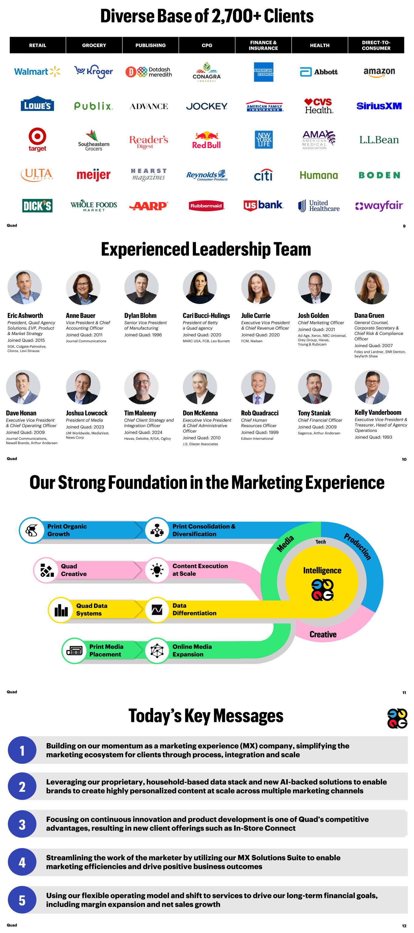 RETAIL GROCERY PUBLISHING CPG FINANCE & INSURANCE HEALTH DIRECT-TO- CONSUMER Quad 9 Executive Vice President & Chief Operating Officer Joined Quad: 2009 Journal Communications, Newell Brands, Arthur Andersen Chief Marketing Officer Joined Quad: 2021 Ad Age, Xerox, NBC Universal, Grey Group, Havas, Young & Rubicam General Counsel, Corporate Secretary & Chief Risk & Compliance Officer Joined Quad: 2007 Foley and Lardner, SNR Denton, Seyfarth Shaw President of Media Joined Quad: 2023 UM Worldwide, MediaVest, News Corp Chief Human Resources Officer Joined Quad: 1999 Edison International Executive Vice President & Treasurer, Head of Agency Operations Joined Quad: 1993 Chief Financial Officer Joined Quad: 2009 Sagence, Arthur Andersen Executive Vice President & Chief Administrative Officer Joined Quad: 2010 J.S. Eliezer Associates Executive Vice President & Chief Revenue Officer Joined Quad: 2020 FCM, Nielsen Senior Vice President of Manufacturing Joined Quad: 1996 President, Quad Agency Solutions; EVP, Product & Market Strategy Joined Quad: 2015 SGK, Colgate-Palmolive, Clorox, Levi Strauss President of Betty a Quad agency Joined Quad: 2020 MARC USA, FCB, Leo Burnett Vice President & Chief Accounting Officer Joined Quad: 2011 Journal Communications Quad 10 Chief Client Strategy and Integration Officer Joined Quad: 2024 Havas, Deloitte, R/GA, Ogilvy Online Media Expansion Content Execution at Scale Print Consolidation & Diversification Data Differentiation Quad Creative Quad 11 Quad Data Systems Print Media Placement Print Organic Growth Focusing on continuous innovation and product development is one of Quad’s competitive advantages, resulting in new client offerings such as In-Store Connect Streamlining the work of the marketer by utilizing our MX Solutions Suite to enable marketing efficiencies and drive positive business outcomes Using our flexible operating model and shift to services to drive our long-term financial goals, including margin expansion and net sales growth Leveraging our proprietary, household-based data stack and new AI-backed solutions to enable brands to create highly personalized content at scale across multiple marketing channels Building on our momentum as a marketing experience (MX) company, simplifying the marketing ecosystem for clients through process, integration and scale Quad 12