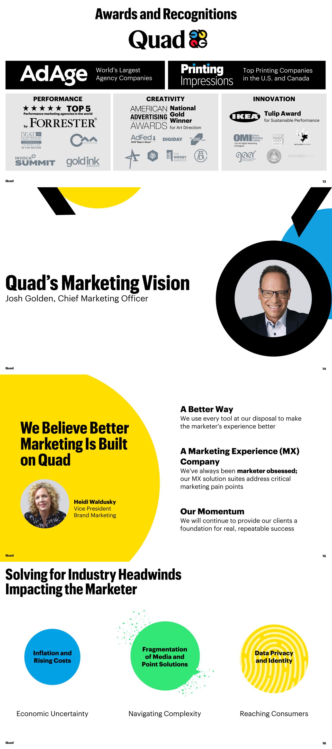 Top Printing Companies in the U.S. and Canada PERFORMANCE CREATIVITY INNOVATION 2019 “Best in Show” Top 40 Digital Marketing Strategists National Gold Winner for Art Direction Tulip Award for Sustainable Performance Performance marketing agencies in the world TOP 5 by World’s Largest Agency Companies Quad 13 Josh Golden, Chief Marketing Officer Quad 14 A Better Way We use every tool at our disposal to make the marketer’s experience better A Marketing Experience (MX) Company We’ve always been marketer obsessed; our MX solution suites address critical marketing pain points Our Momentum We will continue to provide our clients a foundation for real, repeatable success Heidi Waldusky Vice President Brand Marketing Quad 15 Inflation and Rising Costs Data Privacy and Identity Fragmentation of Media and Point Solutions Reaching ConsumersNavigating Complexity Economic Uncertainty Quad 16