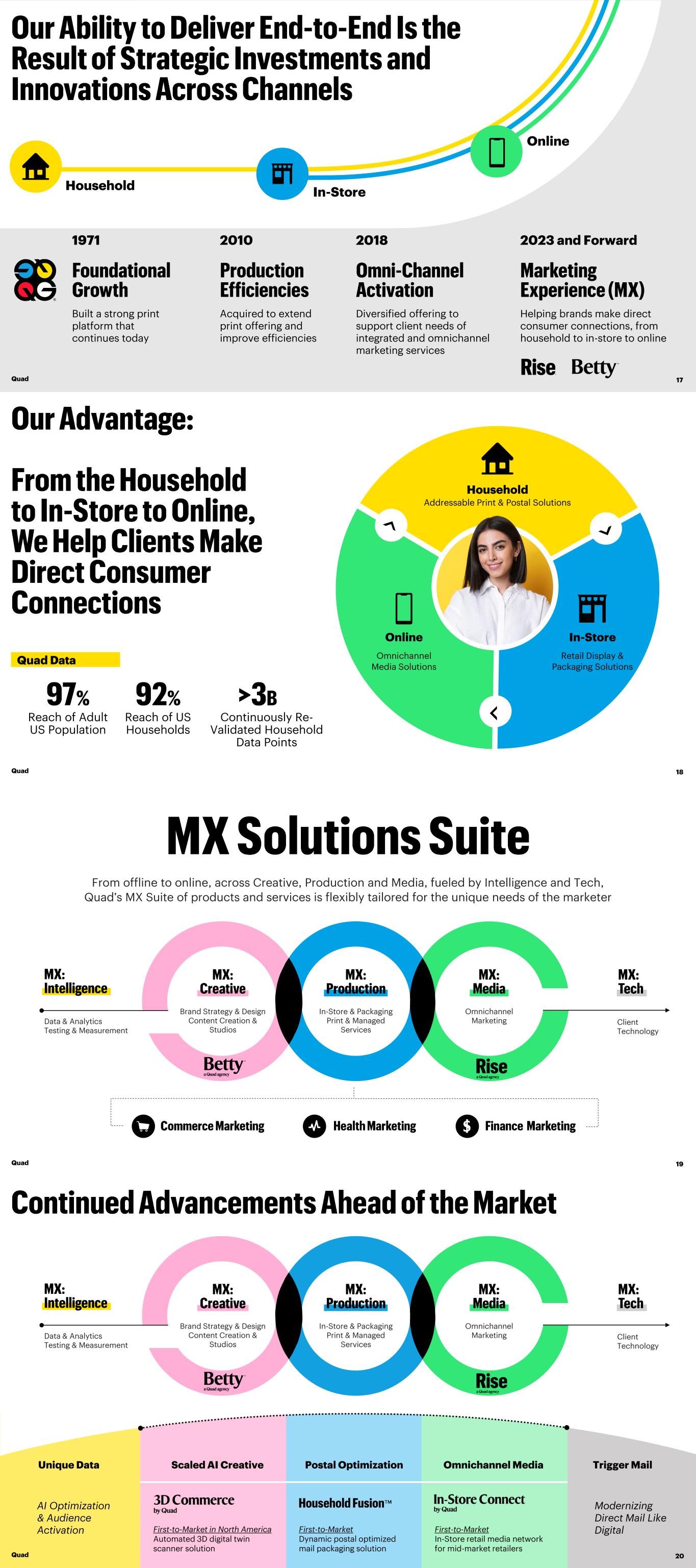 Diversified offering to support client needs of integrated and omnichannel marketing services Built a strong print platform that continues today 1971 Acquired to extend print offering and improve efficiencies Household In-Store Online 2010 2018 Helping brands make direct consumer connections, from household to in-store to online 2023 and Forward Quad 17 In-Store Household Online Retail Display & Packaging Solutions Omnichannel Media Solutions Addressable Print & Postal Solutions Quad Data Reach of Adult US Population Continuously Re- Validated Household Data Points Reach of US Households Quad 18 From offline to online, across Creative, Production and Media, fueled by Intelligence and Tech, Quad’s MX Suite of products and services is flexibly tailored for the unique needs of the marketer Omnichannel Marketing In-Store & Packaging Print & Managed Services Brand Strategy & Design Content Creation & Studios Client Technology Data & Analytics Testing & Measurement Quad 19 20 Scaled AI Creative Postal Optimization Omnichannel Media First-to-Market in North America Automated 3D digital twin scanner solution First-to-Market Dynamic postal optimized mail packaging solution First-to-Market In-Store retail media network for mid-market retailers Unique Data AI Optimization & Audience Activation Trigger Mail Modernizing Direct Mail Like Digital Omnichannel Marketing In-Store & Packaging Print & Managed Services Brand Strategy & Design Content Creation & Studios Client Technology Data & Analytics Testing & Measurement Quad