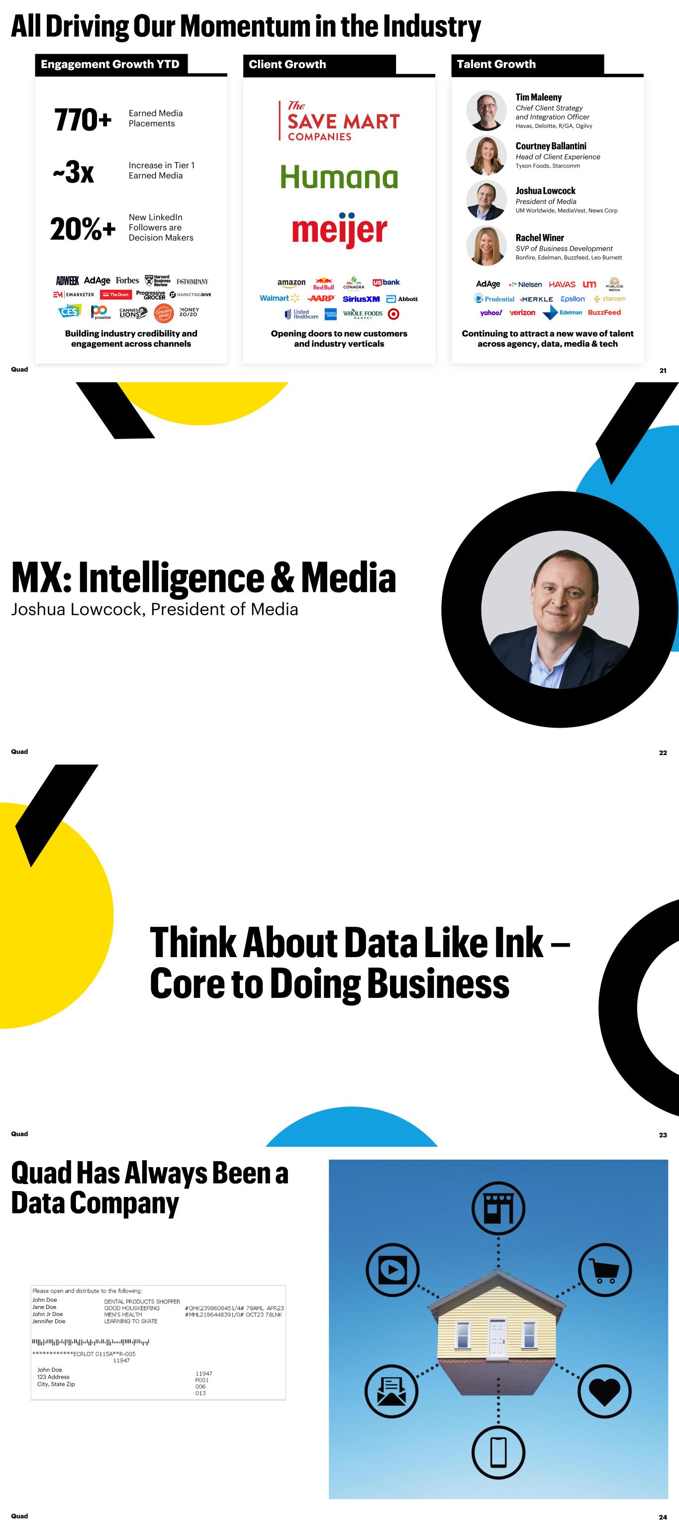 Talent Growth President of Media UM Worldwide, MediaVest, News Corp Continuing to attract a new wave of talent across agency, data, media & tech Head of Client Experience Tyson Foods, Starcomm Client Growth Opening doors to new customers and industry verticals Engagement Growth YTD New LinkedIn Followers are Decision Makers Increase in Tier 1 Earned Media Earned Media Placements Building industry credibility and engagement across channels Quad 21 Chief Client Strategy and Integration Officer Havas, Deloitte, R/GA, Ogilvy SVP of Business Development Bonfire, Edelman, Buzzfeed, Leo Burnett Joshua Lowcock, President of Media Quad 22 Quad 23 John Doe 123 Address City, State Zip John Doe Jane Doe John Jr Doe Jennifer Doe Quad 24