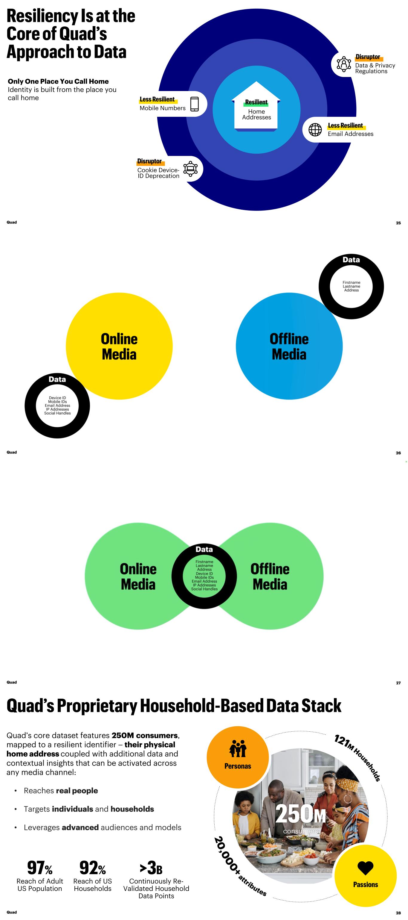 Cookie Device- ID Deprecation Email Addresses Only One Place You Call Home Identity is built from the place you call home Data & Privacy Regulations Mobile Numbers Home Addresses Quad 25 Quad 26 Quad 27 121M Househ o ld s Quad’s core dataset features 250M consumers, mapped to a resilient identifier ⎯ their physical home address coupled with additional data and contextual insights that can be activated across any media channel: • Reaches real people • Targets individuals and households • Leverages advanced audiences and models consumers2 0 ,0 0 0 + attributes Reach of Adult US Population Continuously Re- Validated Household Data Points Reach of US Households Quad 28