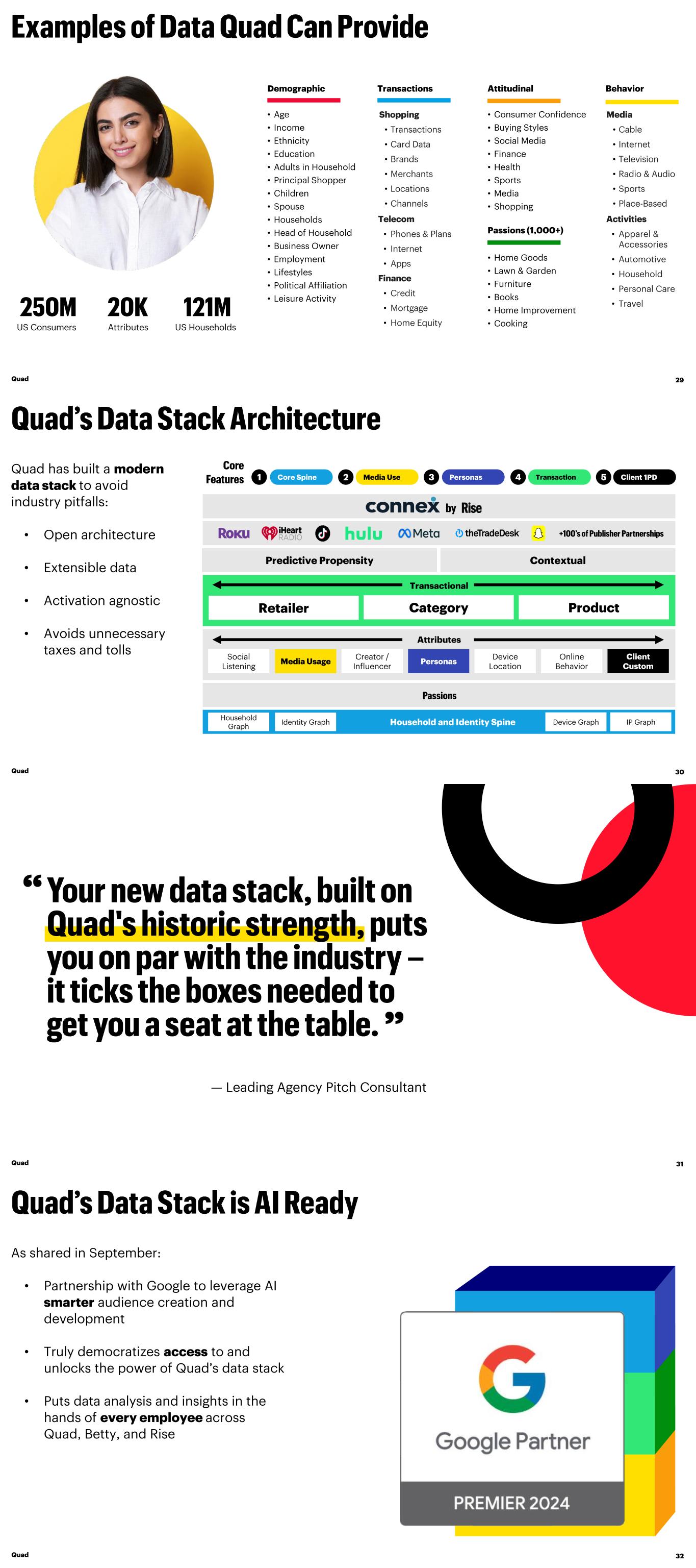 US Consumers Attributes US Households Demographic • Age • Income • Ethnicity • Education • Adults in Household • Principal Shopper • Children • Spouse • Households • Head of Household • Business Owner • Employment • Lifestyles • Political Affiliation • Leisure Activity Transactions Shopping • Transactions • Card Data • Brands • Merchants • Locations • Channels Telecom • Phones & Plans • Internet • Apps Finance • Credit • Mortgage • Home Equity Attitudinal Passions (1,000+) • Consumer Confidence • Buying Styles • Social Media • Finance • Health • Sports • Media • Shopping • Home Goods • Lawn & Garden • Furniture • Books • Home Improvement • Cooking Behavior Media • Cable • Internet • Television • Radio & Audio • Sports • Place-Based Activities • Apparel & Accessories • Automotive • Household • Personal Care • Travel Quad 29 Contextual Transactional Attributes Household and Identity Spine Predictive Propensity Client Custom Online Behavior Device Location Personas Creator / Influencer Media Usage Social Listening ProductCategoryRetailer IP GraphDevice Graph Household Graph Identity Graph 1 Core Spine 2 Media Use 3 Personas 4 Transaction 5 Client 1PD Quad has built a modern data stack to avoid industry pitfalls: • Open architecture • Extensible data • Activation agnostic • Avoids unnecessary taxes and tolls Quad 30 — Leading Agency Pitch Consultant “ ” Quad 31 As shared in September: • Partnership with Google to leverage AI smarter audience creation and development • Truly democratizes access to and unlocks the power of Quad’s data stack • Puts data analysis and insights in the hands of every employee across Quad, Betty, and Rise Quad 32