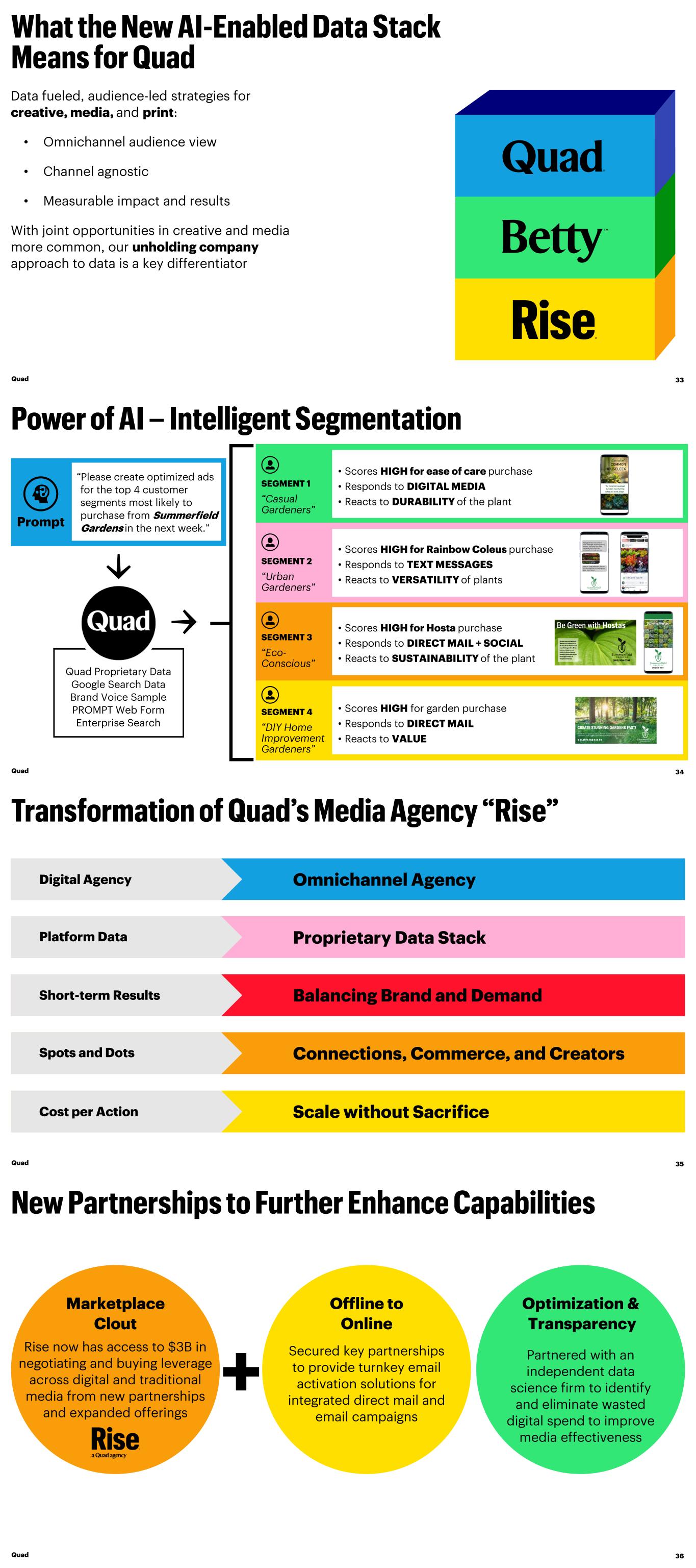 Quad 33 Data fueled, audience-led strategies for creative, media, and print: • Omnichannel audience view • Channel agnostic • Measurable impact and results With joint opportunities in creative and media more common, our unholding company approach to data is a key differentiator “Please create optimized ads for the top 4 customer segments most likely to purchase from Summerfield Gardens in the next week.” Quad Proprietary Data Google Search Data Brand Voice Sample PROMPT Web Form Enterprise Search MONTHS SEGMENT 1 “Casual Gardeners” Prompt • Scores HIGH for Rainbow Coleus purchase • Responds to TEXT MESSAGES • Reacts to VERSATILITY of plants • Scores HIGH for Hosta purchase • Responds to DIRECT MAIL + SOCIAL • Reacts to SUSTAINABILITY of the plant • Scores HIGH for garden purchase • Responds to DIRECT MAIL • Reacts to VALUE • Scores HIGH for ease of care purchase • Responds to DIGITAL MEDIA • Reacts to DURABILITY of the plant Succulent COMMON HOUSELEEK The Common Houseleek Succulent has charming colors and exotic foliage. Be Green with Hostas Hostas are contagious! We have a collection of Hostas that will enchant any shade garden. They are easy to grow and hardy in almost every growing zone and come in a huge variety of shapes and sizes. Stunning Hostas (262) 530-0258 (262) 530-0258 CREATE STUNNING GARDENS FAST! John, Watch as your garden comes to life with stunning lily blooms in an array of captivating hues, adding charm and sophistication to any landscape. 6 PLANTS FOR $19.99 SEGMENT 2 “Urban Gardeners” Healthy plants, happy life! Few gardeners are content with the length of their growing season. We found the most versatile plants that can withstand the heat and sun. Visit our huge selection. We are 100% committed to helping you grow your future. SEGMENT 3 “Eco- Conscious” SEGMENT 4 “DIY Home Improvement Gardeners” Quad 34 Omnichannel AgencyDigital Agency Proprietary Data StackPlatform Data Balancing Brand and DemandShort-term Results Connections, Commerce, and CreatorsSpots and Dots Scale without SacrificeCost per Action Quad 35 Secured key partnerships to provide turnkey email activation solutions for integrated direct mail and email campaigns Partnered with an independent data science firm to identify and eliminate wasted digital spend to improve media effectiveness Rise now has access to $3B in negotiating and buying leverage across digital and traditional media from new partnerships and expanded offerings Quad 36 + Offline to Online Optimization & Transparency Marketplace Clout