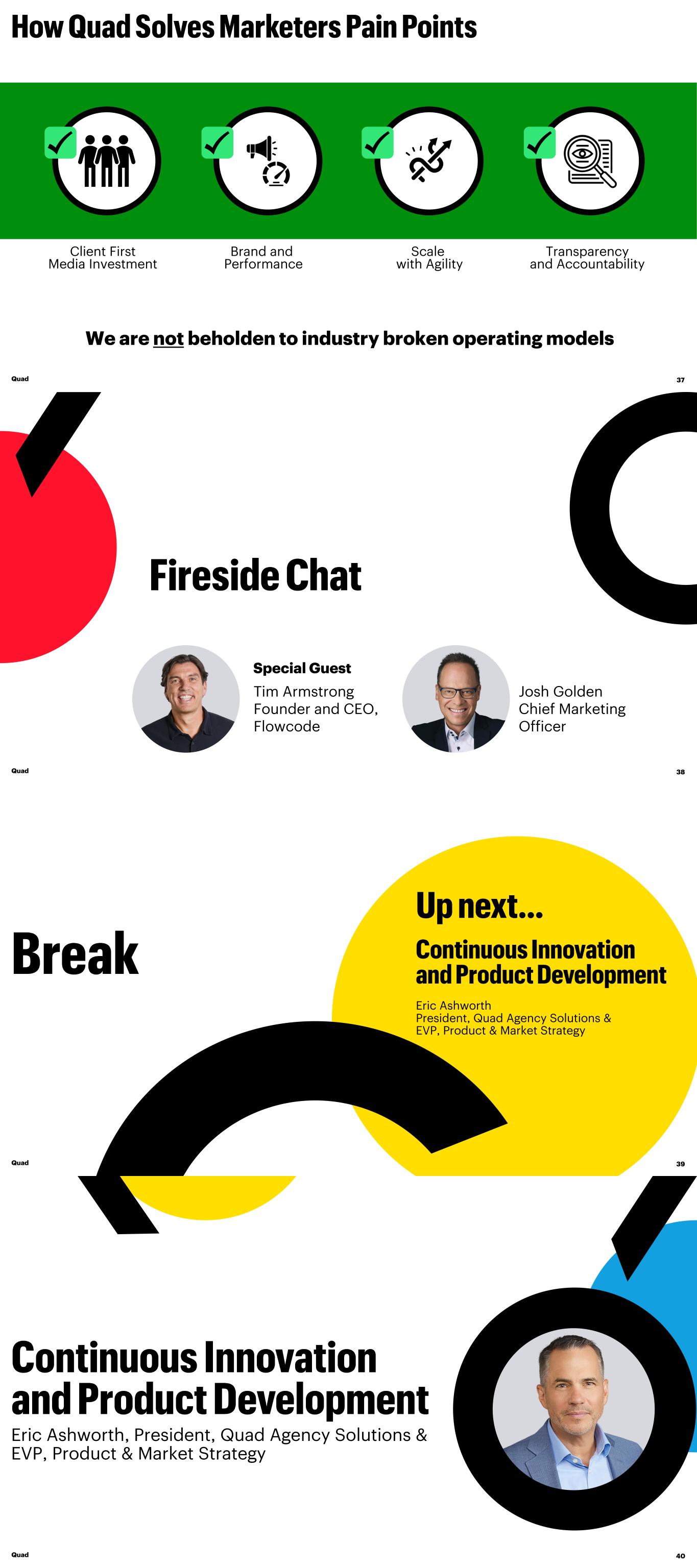 Scale with Agility Client First Media Investment Brand and Performance Transparency and Accountability We are not beholden to industry broken operating models Quad 37 Josh Golden Chief Marketing Officer Tim Armstrong Founder and CEO, Flowcode Special Guest Quad 38 Eric Ashworth President, Quad Agency Solutions & EVP, Product & Market Strategy Quad 39 Quad 40 Eric Ashworth, President, Quad Agency Solutions & EVP, Product & Market Strategy