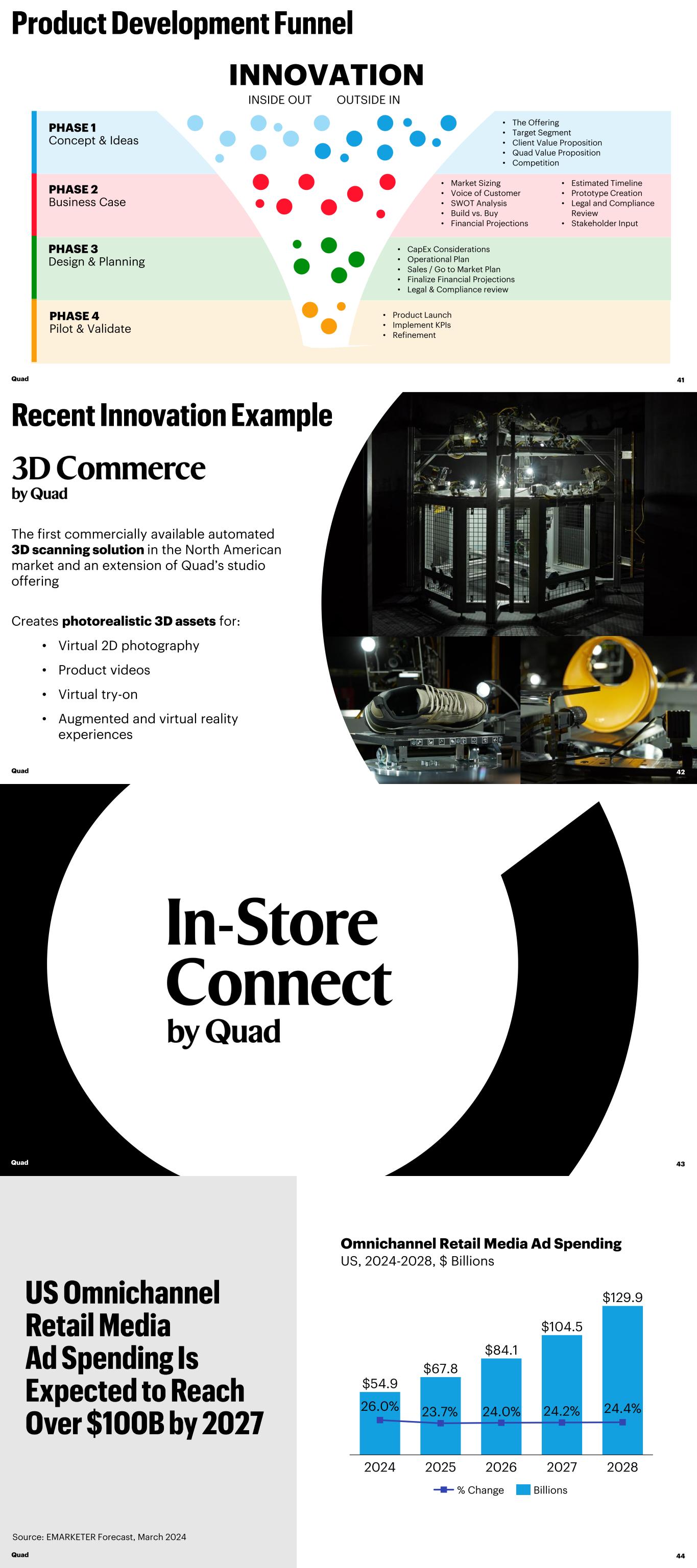 PHASE 1 Concept & Ideas PHASE 2 Business Case PHASE 3 Design & Planning PHASE 4 Pilot & Validate INNOVATION INSIDE OUT OUTSIDE IN • The Offering • Target Segment • Client Value Proposition • Quad Value Proposition • Competition • Market Sizing • Voice of Customer • SWOT Analysis • Build vs. Buy • Financial Projections • Estimated Timeline • Prototype Creation • Legal and Compliance Review • Stakeholder Input • CapEx Considerations • Operational Plan • Sales / Go to Market Plan • Finalize Financial Projections • Legal & Compliance review • Product Launch • Implement KPIs • Refinement Quad 41 42 The first commercially available automated 3D scanning solution in the North American market and an extension of Quad’s studio offering Creates photorealistic 3D assets for: • Virtual 2D photography • Product videos • Virtual try-on • Augmented and virtual reality experiences Quad 43Quad $54.9 $67.8 $84.1 $104.5 $129.9 26.0% 23.7% 24.0% 24.2% 24.4% 2024 2025 2026 2027 2028 % Change Billions Source: EMARKETER Forecast, March 2024 Quad 44 Omnichannel Retail Media Ad Spending US, 2024-2028, $ Billions