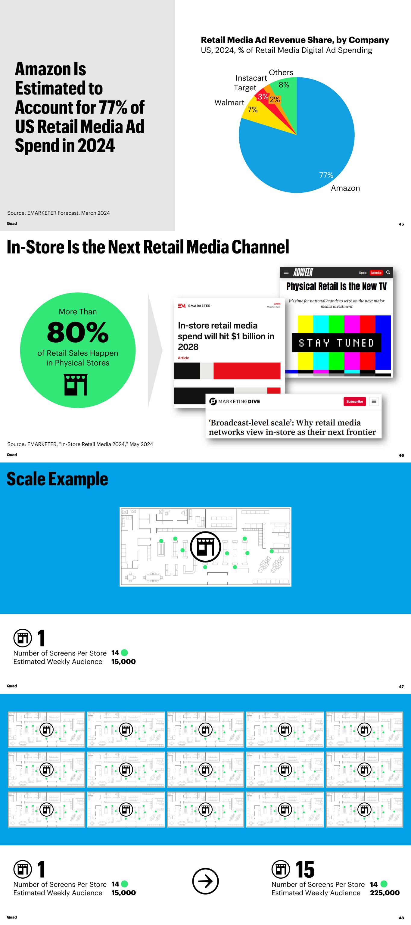 Source: EMARKETER Forecast, March 2024 77% 7% 8% Amazon Walmart 3% Target 2% Instacart Others Retail Media Ad Revenue Share, by Company US, 2024, % of Retail Media Digital Ad Spending Quad 45 80% More Than of Retail Sales Happen in Physical Stores Source: EMARKETER, “In-Store Retail Media 2024,” May 2024 Quad 46 ejoafkdinbglchm Number of Screens Per Store 14 Estimated Weekly Audience 15,000 Quad 47 e j o a f k d i n b g l c h m Number of Screens Per Store 14 Estimated Weekly Audience 15,000 Number of Screens Per Store Estimated Weekly Audience 225,000 14 Quad 48