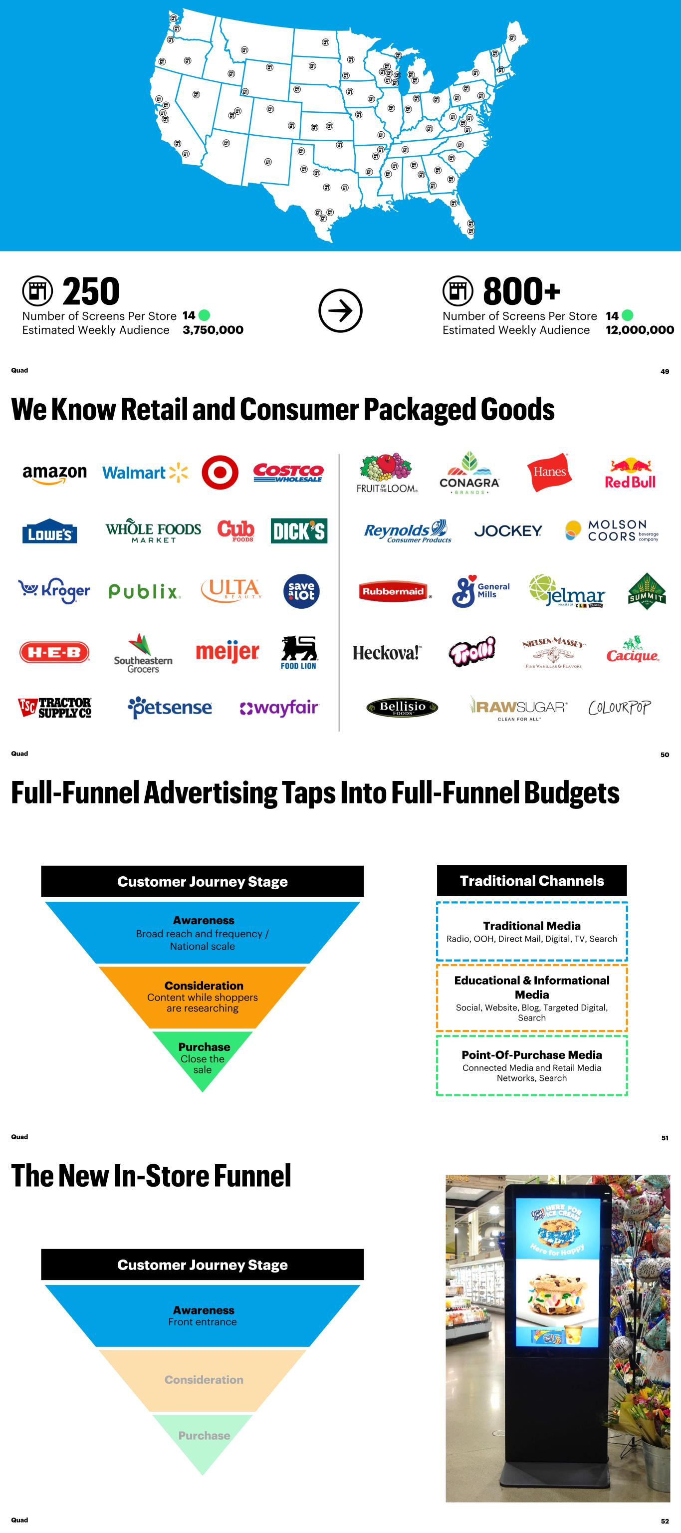 Number of Screens Per Store 14 Estimated Weekly Audience 3,750,000 Number of Screens Per Store 14 Estimated Weekly Audience 12,000,000 Quad 49 Quad 50 Traditional Channels Traditional Media Radio, OOH, Direct Mail, Digital, TV, Search Educational & Informational Media Social, Website, Blog, Targeted Digital, Search Point-Of-Purchase Media Connected Media and Retail Media Networks, Search Quad 51 Awareness Broad reach and frequency / National scale Consideration Content while shoppers are researching Purchase Close the sale Customer Journey Stage Awareness Front entrance Consideration Purchase Customer Journey Stage Quad 52