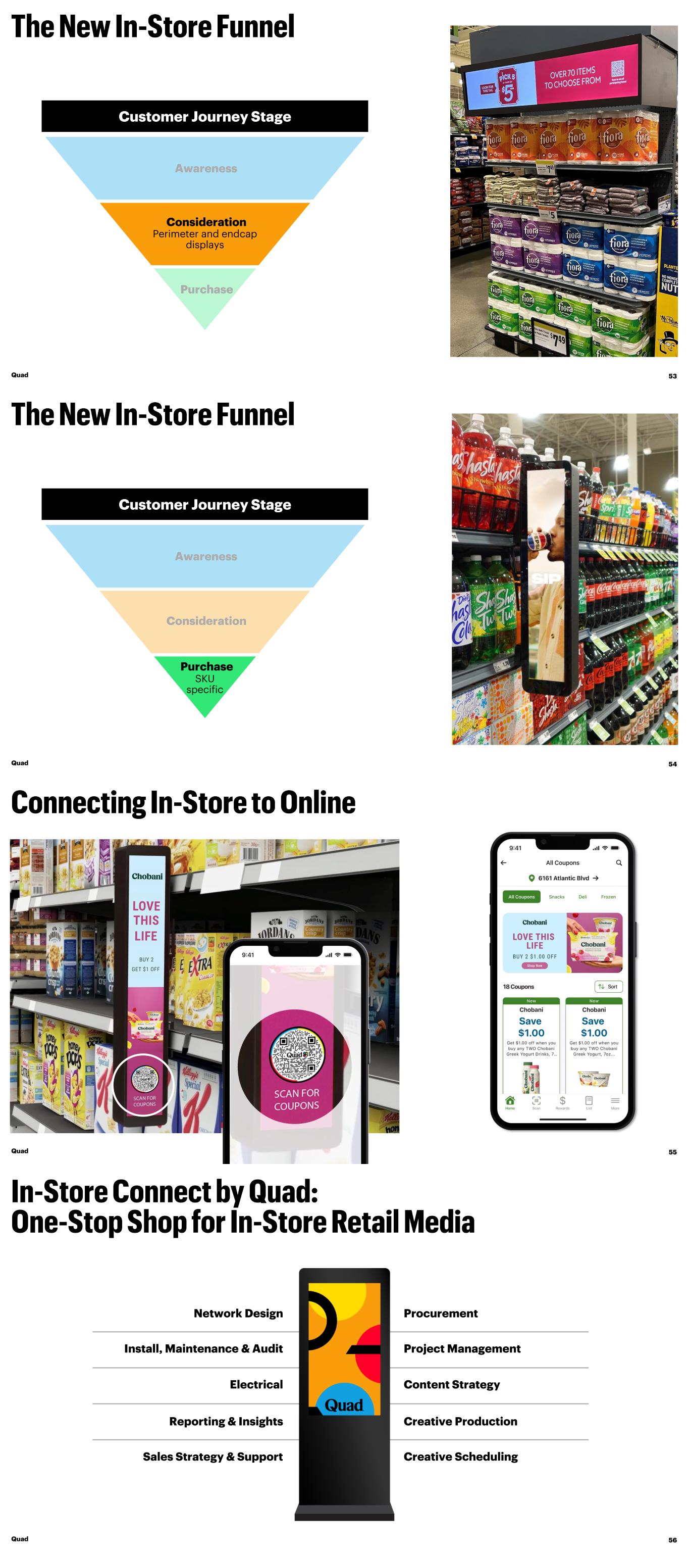 Awareness Consideration Perimeter and endcap displays Purchase Customer Journey Stage Quad 53 Awareness Consideration Purchase SKU specific Customer Journey Stage Quad 54 Quad 55 Install, Maintenance & Audit Electrical Reporting & Insights Sales Strategy & Support Network Design Procurement Project Management Content Strategy Creative Production Creative Scheduling Quad 56
