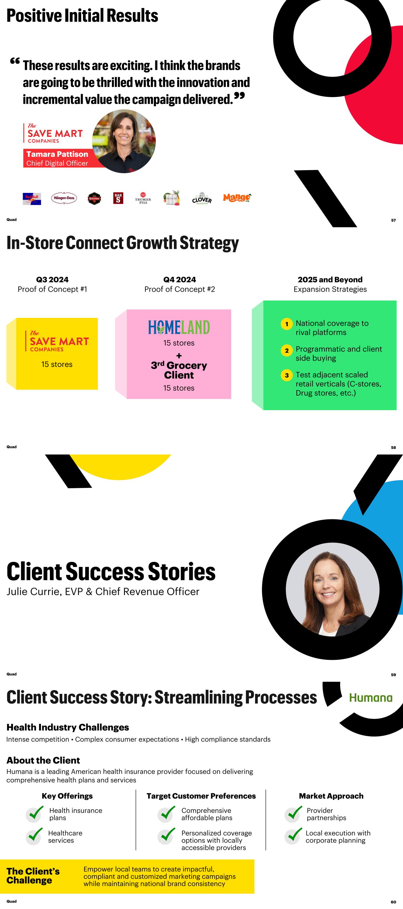 “ ” Quad 57 Tamara Pattison Chief Digital Officer 15 stores Q3 2024 Proof of Concept #1 Q4 2024 Proof of Concept #2 2025 and Beyond Expansion Strategies 15 stores 15 stores + 3rd Grocery Client National coverage to rival platforms Programmatic and client side buying Test adjacent scaled retail verticals (C-stores, Drug stores, etc.) 3 2 1 Quad 58 Julie Currie, EVP & Chief Revenue Officer Quad 59 Quad 60 The Client’s Challenge Empower local teams to create impactful, compliant and customized marketing campaigns while maintaining national brand consistency Intense competition • Complex consumer expectations • High compliance standards Health Industry Challenges About the Client Humana is a leading American health insurance provider focused on delivering comprehensive health plans and services Key Offerings Target Customer Preferences Comprehensive affordable plans Personalized coverage options with locally accessible providers Health insurance plans Healthcare services Market Approach Provider partnerships Local execution with corporate planning
