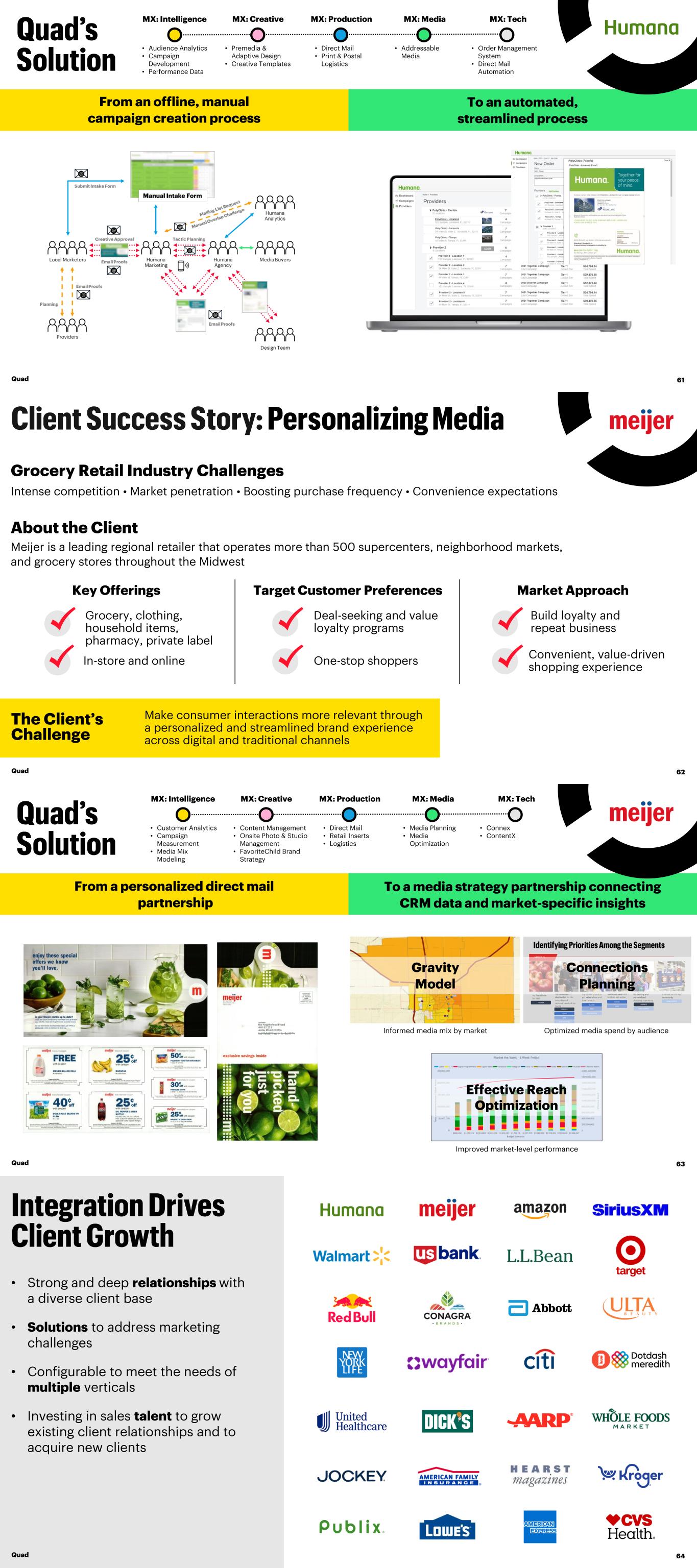 MX: Intelligence • Audience Analytics • Campaign Development • Performance Data MX: Creative • Premedia & Adaptive Design • Creative Templates MX: Production • Direct Mail • Print & Postal Logistics MX: Media • Addressable Media MX: Tech • Order Management System • Direct Mail Automation From an offline, manual campaign creation process To an automated, streamlined process Quad 61 Quad 62 The Client’s Challenge Make consumer interactions more relevant through a personalized and streamlined brand experience across digital and traditional channels About the Client Meijer is a leading regional retailer that operates more than 500 supercenters, neighborhood markets, and grocery stores throughout the Midwest Intense competition • Market penetration • Boosting purchase frequency • Convenience expectations Grocery Retail Industry Challenges Market Approach Build loyalty and repeat business Convenient, value-driven shopping experience Target Customer Preferences Deal-seeking and value loyalty programs One-stop shoppers Key Offerings Grocery, clothing, household items, pharmacy, private label In-store and online Quad 63 MX: Intelligence • Customer Analytics • Campaign Measurement • Media Mix Modeling MX: Creative • Content Management • Onsite Photo & Studio Management • FavoriteChild Brand Strategy MX: Production • Direct Mail • Retail Inserts • Logistics MX: Media • Media Planning • Media Optimization MX: Tech • Connex • ContentX Gravity Model Informed media mix by market Connection s Planning 27 MEIJER IS… my first choice for food my convenient destination for the everyday and seasonal needs of my family my trusted choice to get value where and how I want it quick and easy both in-store and online my exciting and personalized shopping experience a valued part of my community PREMIER CLASSIC BASE NON-SHOPPER CLASSIC BASE NON-SHOPPER CLASSIC BASE PREMIER PREMIER NON-SHOPPER NON-SHOPPER Connections Planning Optimized media spend by audience Effective Reach Optimization Improved market-level performance From a personalized direct mail partnership To a media strategy partnership connecting CRM data and market-specific insights • Strong and deep relationships with a diverse client base • Solutions to address marketing challenges • Configurable to meet the needs of multiple verticals • Investing in sales talent to grow existing client relationships and to acquire new clients Quad 64
