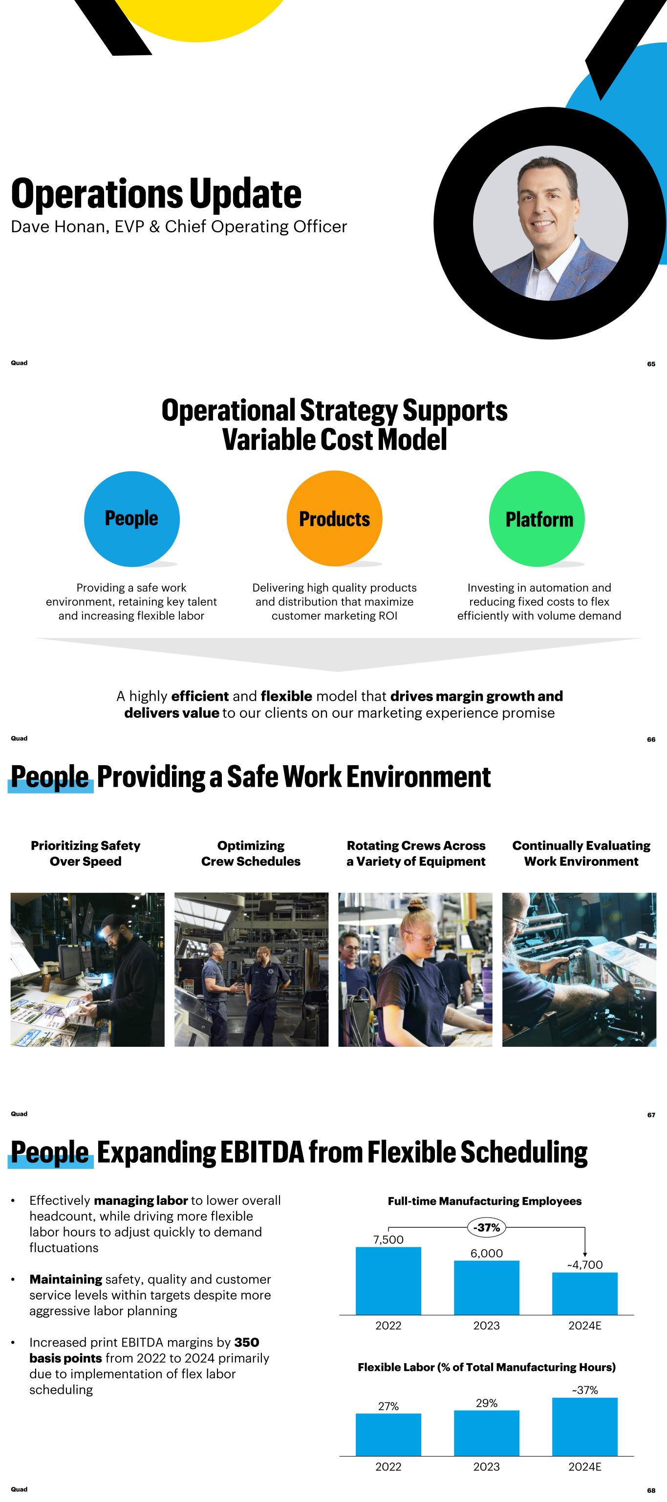 Dave Honan, EVP & Chief Operating Officer Quad 65 A highly efficient and flexible model that drives margin growth and delivers value to our clients on our marketing experience promise Quad 66 Investing in automation and reducing fixed costs to flex efficiently with volume demand Providing a safe work environment, retaining key talent and increasing flexible labor Delivering high quality products and distribution that maximize customer marketing ROI Quad 67 Prioritizing Safety Over Speed Optimizing Crew Schedules Rotating Crews Across a Variety of Equipment Continually Evaluating Work Environment 7,500 6,000 2022 2023 2024E ~4,700 -37% Full-time Manufacturing Employees Flexible Labor (% of Total Manufacturing Hours) 27% 29% 2022 2023 2024E ~37% • Effectively managing labor to lower overall headcount, while driving more flexible labor hours to adjust quickly to demand fluctuations • Maintaining safety, quality and customer service levels within targets despite more aggressive labor planning • Increased print EBITDA margins by 350 basis points from 2022 to 2024 primarily due to implementation of flex labor scheduling Quad 68