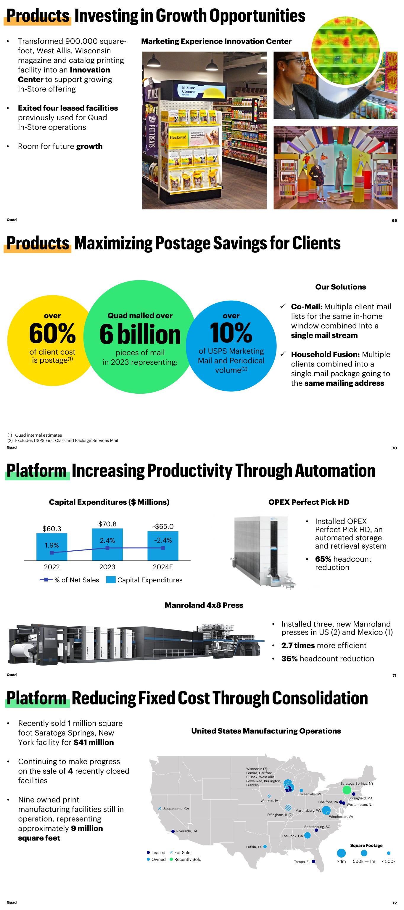 Marketing Experience Innovation Center Quad 69 • Transformed 900,000 square- foot, West Allis, Wisconsin magazine and catalog printing facility into an Innovation Center to support growing In-Store offering • Exited four leased facilities previously used for Quad In-Store operations • Room for future growth ✓ Co-Mail: Multiple client mail lists for the same in-home window combined into a single mail stream ✓ Household Fusion: Multiple clients combined into a single mail package going to the same mailing address Our Solutions (1) Quad internal estimates (2) Excludes USPS First Class and Package Services Mail Quad 70 over of client cost is postage(1) pieces of mail in 2023 representing: Quad mailed over of USPS Marketing Mail and Periodical volume(2) over Capital Expenditures ($ Millions) OPEX Perfect Pick HD $60.3 $70.8 1.9% 2.4% 2022 2023 ~2.4% 2024E ~$65.0 Manroland 4x8 Press • Installed OPEX Perfect Pick HD, an automated storage and retrieval system • 65% headcount reduction • Installed three, new Manroland presses in US (2) and Mexico (1) • 2.7 times more efficient • 36% headcount reduction Quad 71 % of Net Sales Capital Expenditures Square Footage > 1m 500k ― 1m < 500k Leased Owned For Sale Riverside, CA Lufkin, TX The Rock, GA Spartanburg, SC Martinsburg, WV Winchester, VA Westampton, NJ Chalfont, PA Springfield, MA Waukee, IA Greenville, MI Tampa, FL Sacramento, CA Effingham, IL (2) Saratoga Springs, NY Wisconsin (7): Lomira, Hartford, Sussex, West Allis, Pewaukee, Burlington, Franklin Recently Sold • Recently sold 1 million square foot Saratoga Springs, New York facility for $41 million • Continuing to make progress on the sale of 4 recently closed facilities • Nine owned print manufacturing facilities still in operation, representing approximately 9 million square feet United States Manufacturing Operations Quad 72