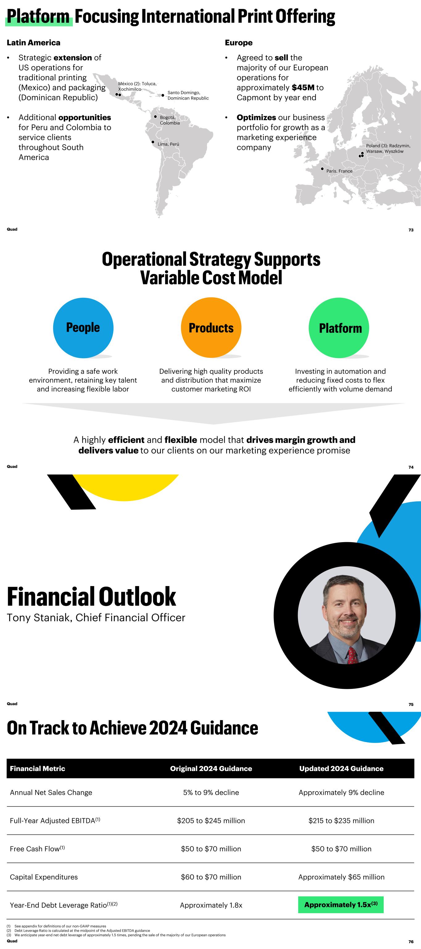 Latin America Quad 73 Europe • Agreed to sell the majority of our European operations for approximately $45M to Capmont by year end • Optimizes our business portfolio for growth as a marketing experience company Lima, Perú Bogotá, Colombia Santo Domingo, Dominican Republic México (2): Toluca, Xochimilco Poland (3): Radzymin, Warsaw, Wyszków Paris, France • Strategic extension of US operations for traditional printing (Mexico) and packaging (Dominican Republic) • Additional opportunities for Peru and Colombia to service clients throughout South America A highly efficient and flexible model that drives margin growth and delivers value to our clients on our marketing experience promise Quad 74 Investing in automation and reducing fixed costs to flex efficiently with volume demand Providing a safe work environment, retaining key talent and increasing flexible labor Delivering high quality products and distribution that maximize customer marketing ROI Tony Staniak, Chief Financial Officer Quad 75 Financial Metric Original 2024 Guidance Updated 2024 Guidance Annual Net Sales Change 5% to 9% decline Approximately 9% decline Full-Year Adjusted EBITDA(1) $205 to $245 million $215 to $235 million Free Cash Flow(1) $50 to $70 million $50 to $70 million Capital Expenditures $60 to $70 million Approximately $65 million Year-End Debt Leverage Ratio(1)(2) Approximately 1.8x Approximately 1.5xAp roximately 1.5x(3) (1) See appendix for definitions of our non-GAAP measures (2) Debt Leverage Ratio is calculated at the midpoint of the Adjusted EBITDA guidance (3) We anticipate year-end net debt leverage of approximately 1.5 times, pending the sale of the majority of our European operations Quad 76