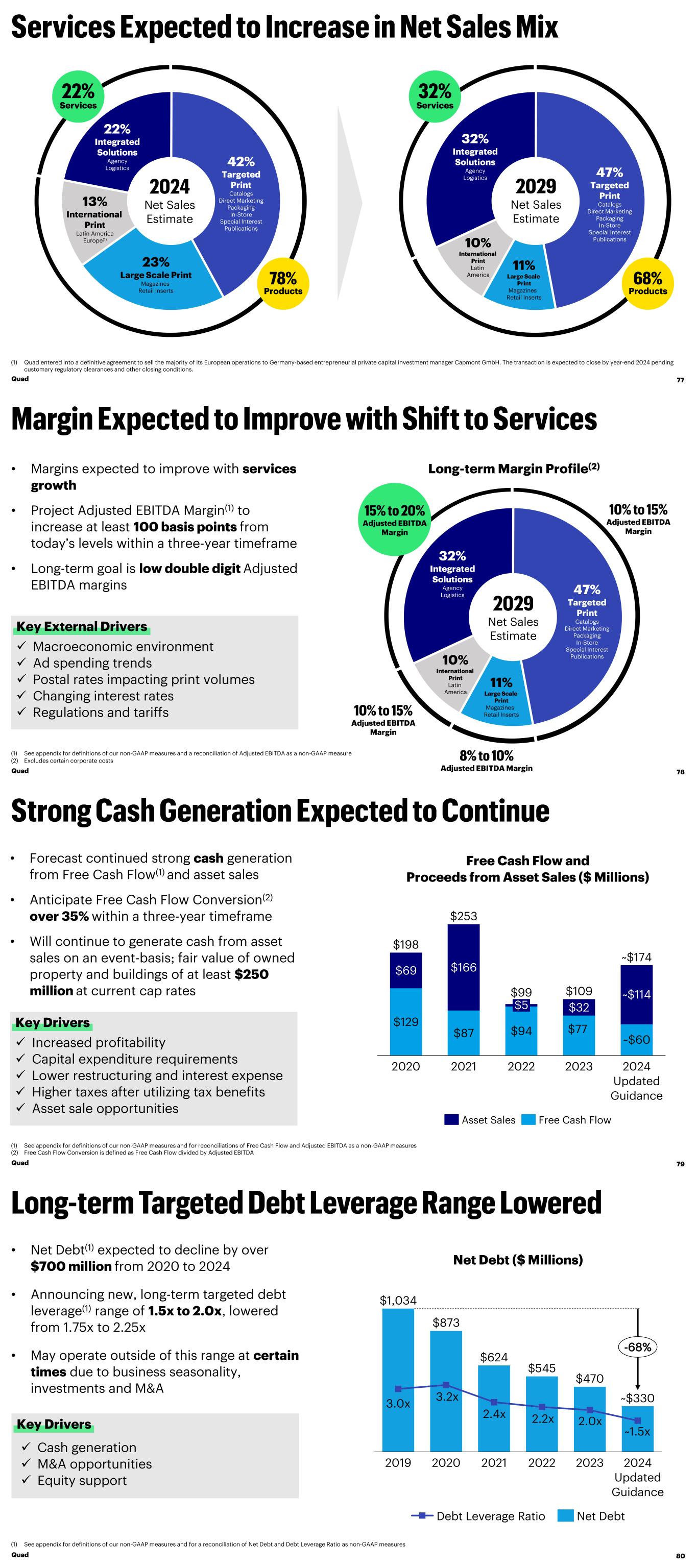32% Integrated Solutions Agency Logistics 11% Large Scale Print Magazines Retail Inserts 47% Targeted Print Catalogs Direct Marketing Packaging In-Store Special Interest Publications Net Sales Estimate Services 22% Integrated Solutions Agency Logistics 23% Large Scale Print Magazines Retail Inserts 42% Targeted Print Catalogs Direct Marketing Packaging In-Store Special Interest Publications Net Sales Estimate 13% International Print Latin America Europe(1) 10% International Print Latin America Quad 77 Services ProductsProducts (1) Quad entered into a definitive agreement to sell the majority of its European operations to Germany-based entrepreneurial private capital investment manager Capmont GmbH. The transaction is expected to close by year-end 2024 pending customary regulatory clearances and other closing conditions. Long-term Margin Profile(2) 32% Integrated Solutions Agency Logistics 11% Large Scale Print Magazines Retail Inserts 47% Targeted Print Catalogs Direct Marketing Packaging In-Store Special Interest Publications Net Sales Estimate 10% International Print Latin America Adjusted EBITDA Margin Adjusted EBITDA Margin Adjusted EBITDA Margin (1) See appendix for definitions of our non-GAAP measures and a reconciliation of Adjusted EBITDA as a non-GAAP measure (2) Excludes certain corporate costs • Margins expected to improve with services growth • Project Adjusted EBITDA Margin(1) to increase at least 100 basis points from today’s levels within a three-year timeframe • Long-term goal is low double digit Adjusted EBITDA margins Quad 78 ✓ Macroeconomic environment ✓ Ad spending trends ✓ Postal rates impacting print volumes ✓ Changing interest rates ✓ Regulations and tariffs Key External Drivers Adjusted EBITDA Margin Free Cash Flow and Proceeds from Asset Sales ($ Millions) $129 $87 $94 $69 $166 $32 2020 2021 $5 2022 $77 2023 ~$114 ~$60 2024 Updated Guidance $198 $253 $99 $109 ~$174 Asset Sales Free Cash Flow ✓ Increased profitability ✓ Capital expenditure requirements ✓ Lower restructuring and interest expense ✓ Higher taxes after utilizing tax benefits ✓ Asset sale opportunities • Forecast continued strong cash generation from Free Cash Flow(1) and asset sales • Anticipate Free Cash Flow Conversion(2) over 35% within a three-year timeframe • Will continue to generate cash from asset sales on an event-basis; fair value of owned property and buildings of at least $250 million at current cap rates Quad 79 (1) See appendix for definitions of our non-GAAP measures and for reconciliations of Free Cash Flow and Adjusted EBITDA as a non-GAAP measures (2) Free Cash Flow Conversion is defined as Free Cash Flow divided by Adjusted EBITDA Key Drivers $1,034 $873 $624 $545 $470 3.0x 3.2x 2.4x 2.2x 2.0x 2019 2020 2021 2022 2023 2024 Updated Guidance ~$330 ~1.5x -68% Debt Leverage Ratio Net Debt Net Debt ($ Millions) • Net Debt(1) expected to decline by over $700 million from 2020 to 2024 • Announcing new, long-term targeted debt leverage(1) range of 1.5x to 2.0x, lowered from 1.75x to 2.25x • May operate outside of this range at certain times due to business seasonality, investments and M&A Quad 80 ✓ Cash generation ✓ M&A opportunities ✓ Equity support (1) See appendix for definitions of our non-GAAP measures and for a reconciliation of Net Debt and Debt Leverage Ratio as non-GAAP measures Key Drivers
