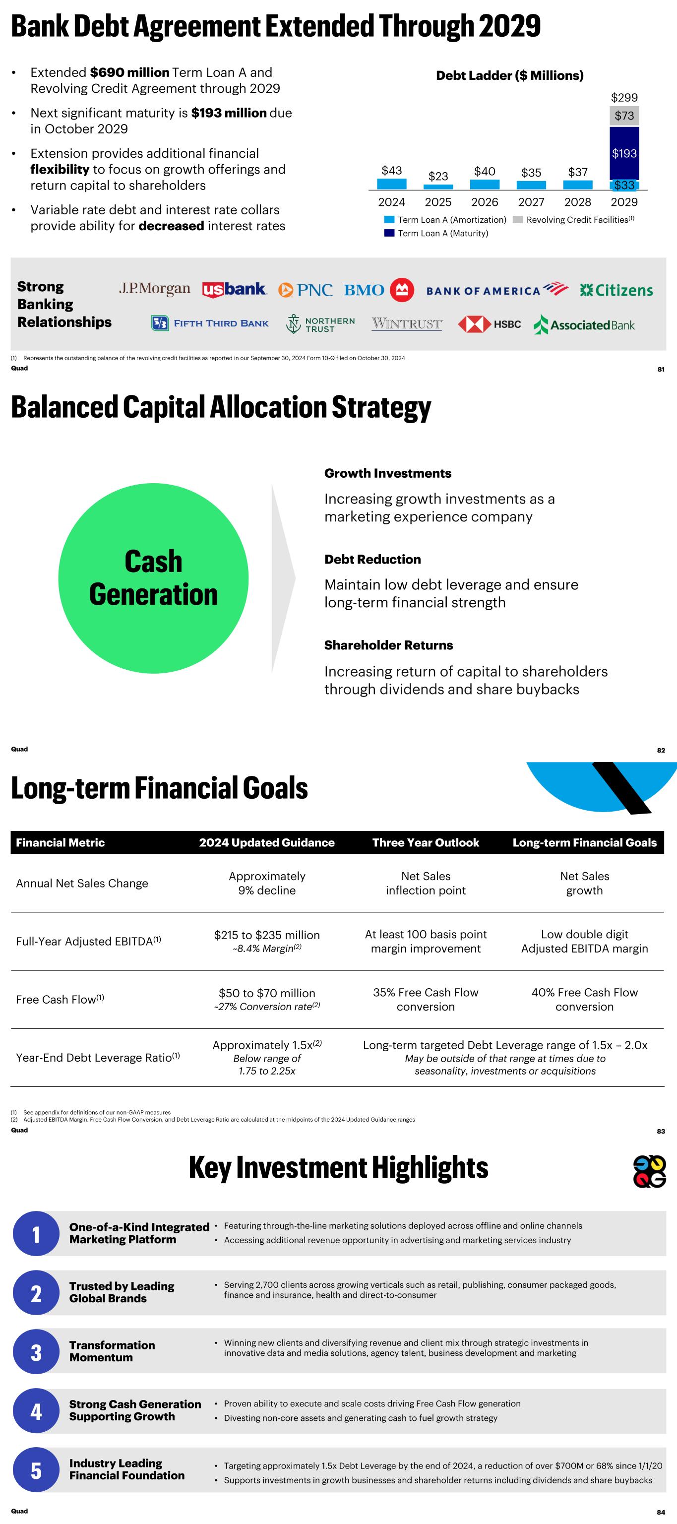 $43 $23 $40 $35 $37 $193 $73 2024 2025 2026 2027 2028 2029 $299 $33 Term Loan A (Amortization) Revolving Credit Facilities(1) Term Loan A (Maturity) Debt Ladder ($ Millions)• Extended $690 million Term Loan A and Revolving Credit Agreement through 2029 • Next significant maturity is $193 million due in October 2029 • Extension provides additional financial flexibility to focus on growth offerings and return capital to shareholders • Variable rate debt and interest rate collars provide ability for decreased interest rates Strong Banking Relationships (1) Represents the outstanding balance of the revolving credit facilities as reported in our September 30, 2024 Form 10-Q filed on October 30, 2024 Quad 81 Increasing growth investments as a marketing experience company Increasing return of capital to shareholders through dividends and share buybacks Maintain low debt leverage and ensure long-term financial strength Debt Reduction Growth Investments Shareholder Returns Quad 82 Financial Metric 2024 Updated Guidance Three Year Outlook Long-term Financial Goals Annual Net Sales Change Approximately 9% decline Net Sales inflection point Net Sales growth Full-Year Adjusted EBITDA(1) $215 to $235 million ~8.4% Margin(2) At least 100 basis point margin improvement Low double digit Adjusted EBITDA margin Free Cash Flow(1) $50 to $70 million ~27% Conversion rate(2) 35% Free Cash Flow conversion 40% Free Cash Flow conversion Year-End Debt Leverage Ratio(1) Approximately 1.5x(2) Below range of 1.75 to 2.25x Long-term targeted Debt Leverage range of 1.5x – 2.0x May be outside of that range at times due to seasonality, investments or acquisitions (1) See appendix for definitions of our non-GAAP measures (2) Adjusted EBITDA Margin, Free Cash Flow Conversion, and Debt Leverage Ratio are calculated at the midpoints of the 2024 Updated Guidance ranges Quad 83 • Winning new clients and diversifying revenue and client mix through strategic investments in innovative data and media solutions, agency talent, business development and marketing Transformation Momentum • Proven ability to execute and scale costs driving Free Cash Flow generation • Divesting non-core assets and generating cash to fuel growth strategy Strong Cash Generation Supporting Growth • Targeting approximately 1.5x Debt Leverage by the end of 2024, a reduction of over $700M or 68% since 1/1/20 • Supports investments in growth businesses and shareholder returns including dividends and share buybacks Industry Leading Financial Foundation • Serving 2,700 clients across growing verticals such as retail, publishing, consumer packaged goods, finance and insurance, health and direct-to-consumer Trusted by Leading Global Brands One-of-a-Kind Integrated Marketing Platform • Featuring through-the-line marketing solutions deployed across offline and online channels • Accessing additional revenue opportunity in advertising and marketing services industry Quad 84