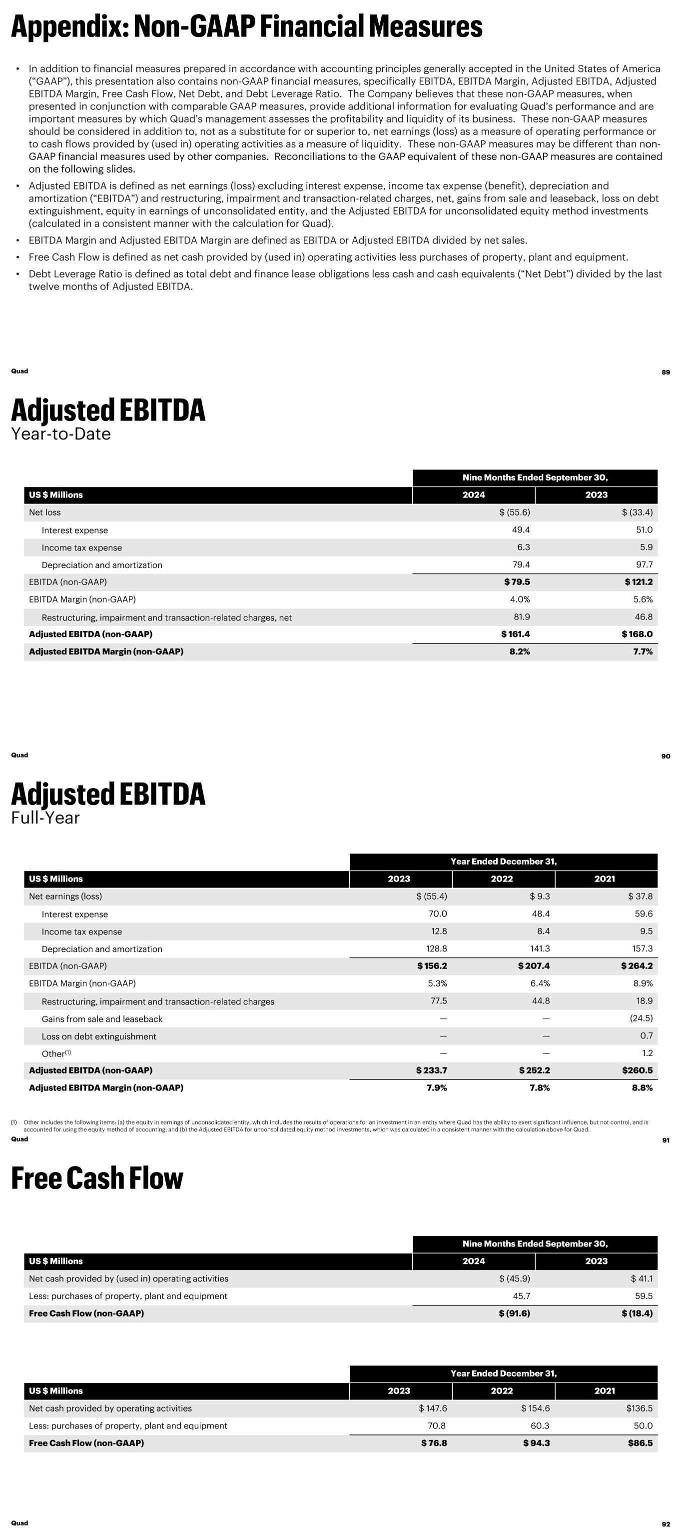 • In addition to financial measures prepared in accordance with accounting principles generally accepted in the United States of America (“GAAP”), this presentation also contains non-GAAP financial measures, specifically EBITDA, EBITDA Margin, Adjusted EBITDA, Adjusted EBITDA Margin, Free Cash Flow, Net Debt, and Debt Leverage Ratio. The Company believes that these non-GAAP measures, when presented in conjunction with comparable GAAP measures, provide additional information for evaluating Quad’s performance and are important measures by which Quad’s management assesses the profitability and liquidity of its business. These non-GAAP measures should be considered in addition to, not as a substitute for or superior to, net earnings (loss) as a measure of operating performance or to cash flows provided by (used in) operating activities as a measure of liquidity. These non-GAAP measures may be different than non- GAAP financial measures used by other companies. Reconciliations to the GAAP equivalent of these non-GAAP measures are contained on the following slides. • Adjusted EBITDA is defined as net earnings (loss) excluding interest expense, income tax expense (benefit), depreciation and amortization (“EBITDA”) and restructuring, impairment and transaction-related charges, net, gains from sale and leaseback, loss on debt extinguishment, equity in earnings of unconsolidated entity, and the Adjusted EBITDA for unconsolidated equity method investments (calculated in a consistent manner with the calculation for Quad). • EBITDA Margin and Adjusted EBITDA Margin are defined as EBITDA or Adjusted EBITDA divided by net sales. • Free Cash Flow is defined as net cash provided by (used in) operating activities less purchases of property, plant and equipment. • Debt Leverage Ratio is defined as total debt and finance lease obligations less cash and cash equivalents (“Net Debt”) divided by the last twelve months of Adjusted EBITDA. Quad 89 Year-to-Date Nine Months Ended September 30, US $ Millions 2024 2023 Net loss $ (55.6) $ (33.4) Interest expense 49.4 51.0 Income tax expense 6.3 5.9 Depreciation and amortization 79.4 97.7 EBITDA (non-GAAP) $ 79.5 $ 121.2 EBITDA Margin (non-GAAP) 4.0% 5.6% Restructuring, impairment and transaction-related charges, net 81.9 46.8 Adjusted EBITDA (non-GAAP) $ 161.4 $ 168.0 Adjusted EBITDA Margin (non-GAAP) 8.2% 7.7% Quad 90 Full-Year Year Ended December 31, US $ Millions 2023 2022 2021 Net earnings (loss) $ (55.4) $ 9.3 $ 37.8 Interest expense 70.0 48.4 59.6 Income tax expense 12.8 8.4 9.5 Depreciation and amortization 128.8 141.3 157.3 EBITDA (non-GAAP) $ 156.2 $ 207.4 $ 264.2 EBITDA Margin (non-GAAP) 5.3% 6.4% 8.9% Restructuring, impairment and transaction-related charges 77.5 44.8 18.9 Gains from sale and leaseback — — (24.5) Loss on debt extinguishment — — 0.7 Other(1) — — 1.2 Adjusted EBITDA (non-GAAP) $ 233.7 $ 252.2 $260.5 Adjusted EBITDA Margin (non-GAAP) 7.9% 7.8% 8.8% (1) Other includes the following items: (a) the equity in earnings of unconsolidated entity, which includes the results of operations for an investment in an entity where Quad has the ability to exert significant influence, but not control, and is accounted for using the equity method of accounting; and (b) the Adjusted EBITDA for unconsolidated equity method investments, which was calculated in a consistent manner with the calculation above for Quad. Quad 91 Nine Months Ended September 30, US $ Millions 2024 2023 Net cash provided by (used in) operating activities $ (45.9) $ 41.1 Less: purchases of property, plant and equipment 45.7 59.5 Free Cash Flow (non-GAAP) $ (91.6) $ (18.4) Year Ended December 31, US $ Millions 2023 2022 2021 Net cash provided by operating activities $ 147.6 $ 154.6 $136.5 Less: purchases of property, plant and equipment 70.8 60.3 50.0 Free Cash Flow (non-GAAP) $ 76.8 $ 94.3 $86.5 Quad 92
