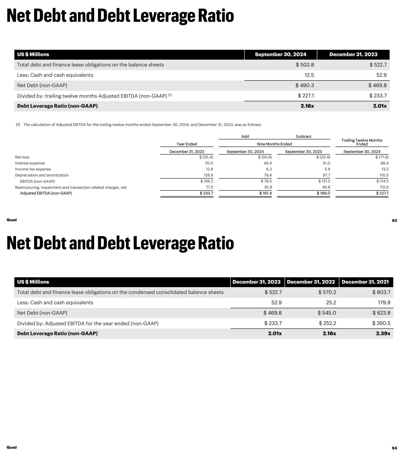 US $ Millions September 30, 2024 December 31, 2023 Total debt and finance lease obligations on the balance sheets $ 502.8 $ 522.7 Less: Cash and cash equivalents 12.5 52.9 Net Debt (non-GAAP) $ 490.3 $ 469.8 Divided by: trailing twelve months Adjusted EBITDA (non-GAAP) (1) $ 227.1 $ 233.7 Debt Leverage Ratio (non-GAAP) 2.16x 2.01x (1) The calculation of Adjusted EBITDA for the trailing twelve months ended September 30, 2024, and December 31, 2023, was as follows: Add Subtract Trailing Twelve Months EndedYear Ended Nine Months Ended December 31, 2023 September 30, 2024 September 30, 2023 September 30, 2024 Net loss $ (55.4) $ (55.6) $ (33.4) $ (77.6) Interest expense 70.0 49.4 51.0 68.4 Income tax expense 12.8 6.3 5.9 13.2 Depreciation and amortization 128.8 79.4 97.7 110.5 EBITDA (non-GAAP) $ 156.2 $ 79.5 $ 121.2 $ 114.5 Restructuring, impairment and transaction-related charges, net 77.5 81.9 46.8 112.6 Adjusted EBITDA (non-GAAP) $ 233.7 $ 161.4 $ 168.0 $ 227.1 Quad 93 US $ Millions December 31, 2023 December 31, 2022 December 31, 2021 Total debt and finance lease obligations on the condensed consolidated balance sheets $ 522.7 $ 570.2 $ 803.7 Less: Cash and cash equivalents 52.9 25.2 179.9 Net Debt (non-GAAP) $ 469.8 $ 545.0 $ 623.8 Divided by: Adjusted EBITDA for the year ended (non-GAAP) $ 233.7 $ 252.2 $ 260.5 Debt Leverage Ratio (non-GAAP) 2.01x 2.16x 2.39x Quad 94