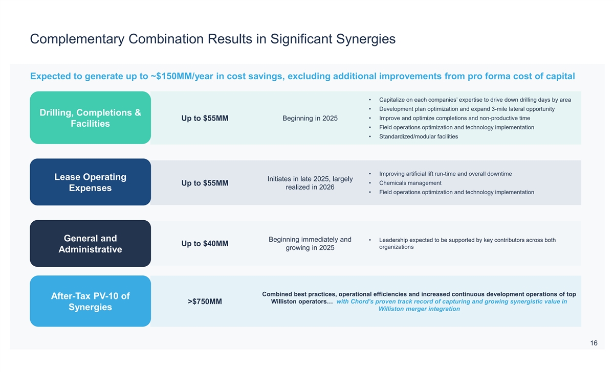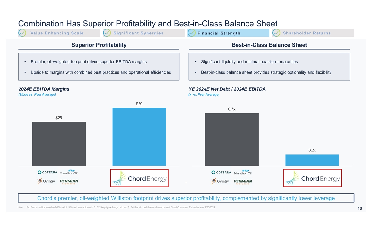 Complementary Combination Results in Significant Synergies Value Enhancing Scale Significant Synergies Financial Strength Shareholder Returns Combination drives >$750MM (After-Tax PV-10) of estimated synergies, as a result of up to $150MM/year in expected cost savings After-Tax PV-10 > $750MM Initiates in late 2025, largely realized in 2026 Beginning in 2025 Up to $55MM Up to $150MM Beginning immediately and growing in 2025 Up to $55MM Up to $40MM General and Drilling, Completions & Lease Operating Total Administrative Facilities Expenses Synergies Chord has a proven track record of capturing and growing synergistic value in Williston merger integration 9