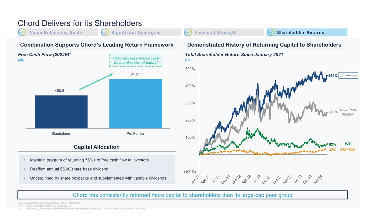 Combination Has Superior Profitability and Best-in-Class Balance Sheet Value Enhancing Scale Significant Synergies Financial Strength Shareholder Returns Superior Profitability Best-in-Class Balance Sheet • Premier, oil-weighted footprint drives superior EBITDA margins • Significant liquidity and minimal near-term maturities • Upside to margins with combined best practices and operational efficiencies • Best-in-class balance sheet provides strategic optionality and flexibility 2024E EBITDA Margins YE 2024E Net Debt / 2024E EBITDA ($/boe vs. Peer Average) (x vs. Peer Average) $29 0.7x $25 0.2x ♦ Chord’s premier, oil-weighted Williston footprint drives superior profitability, complemented by significantly lower leverage Note: Pro Forma metrics based on 90% stock / 10% cash transaction with 0.10125 equity exchange ratio and $1.84/share in cash. Metrics based on Wall Street Consensus Estimates as of 2/20/2024. 10