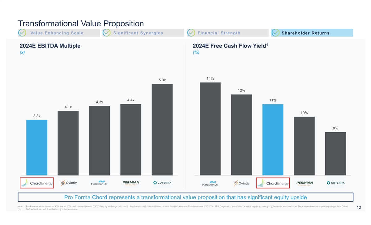 Chord Delivers for its Shareholders Value Enhancing Scale Significant Synergies Financial Strength Shareholder Returns Combination Supports Chord’s Leading Return Framework Demonstrated History of Returning Capital to Shareholders 1 Free Cash Flow (2024E) Total Shareholder Return Since January 2021 >50% increase in free cash ($B) (%) flow and return of capital 500% ~$1.2 462% 400% ~$0.8 300% New Peer 245% Median 200% Standalone Pro Forma 100% WTI 62% Capital Allocation 32% S&P 500 -- • Maintain program of returning 75%+ of free cash flow to investors • Reaffirm annual $5.00/share base dividend (100%) • Underpinned by share buybacks and supplemented with variable dividends Chord has consistently returned more capital to shareholders than its large-cap peer group Source: FactSet, Company Filings. Market data as of 2/20/2024. 11 Note: Peer set includes CTRA, OVV, MRO and PR. (1) Pro forma 2024 estimates based on mid-point of management guidance at $79/bbl WTI and $2.50/MMBtu NYMEX gas.