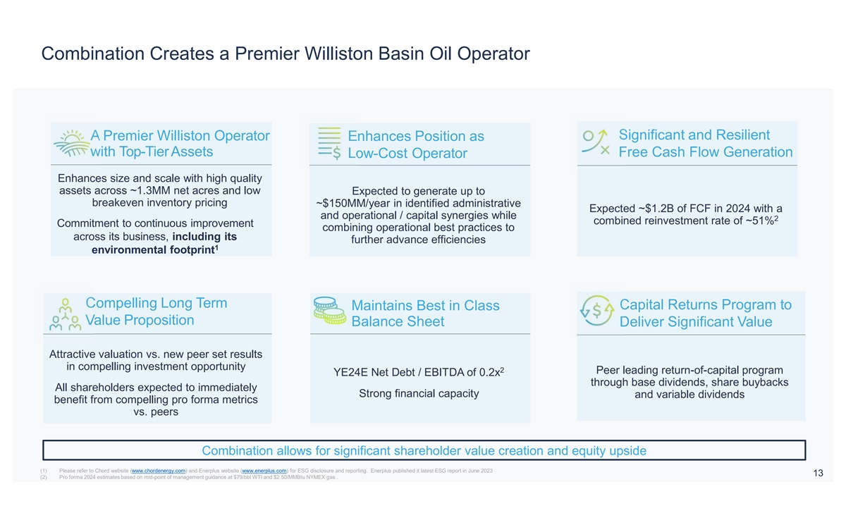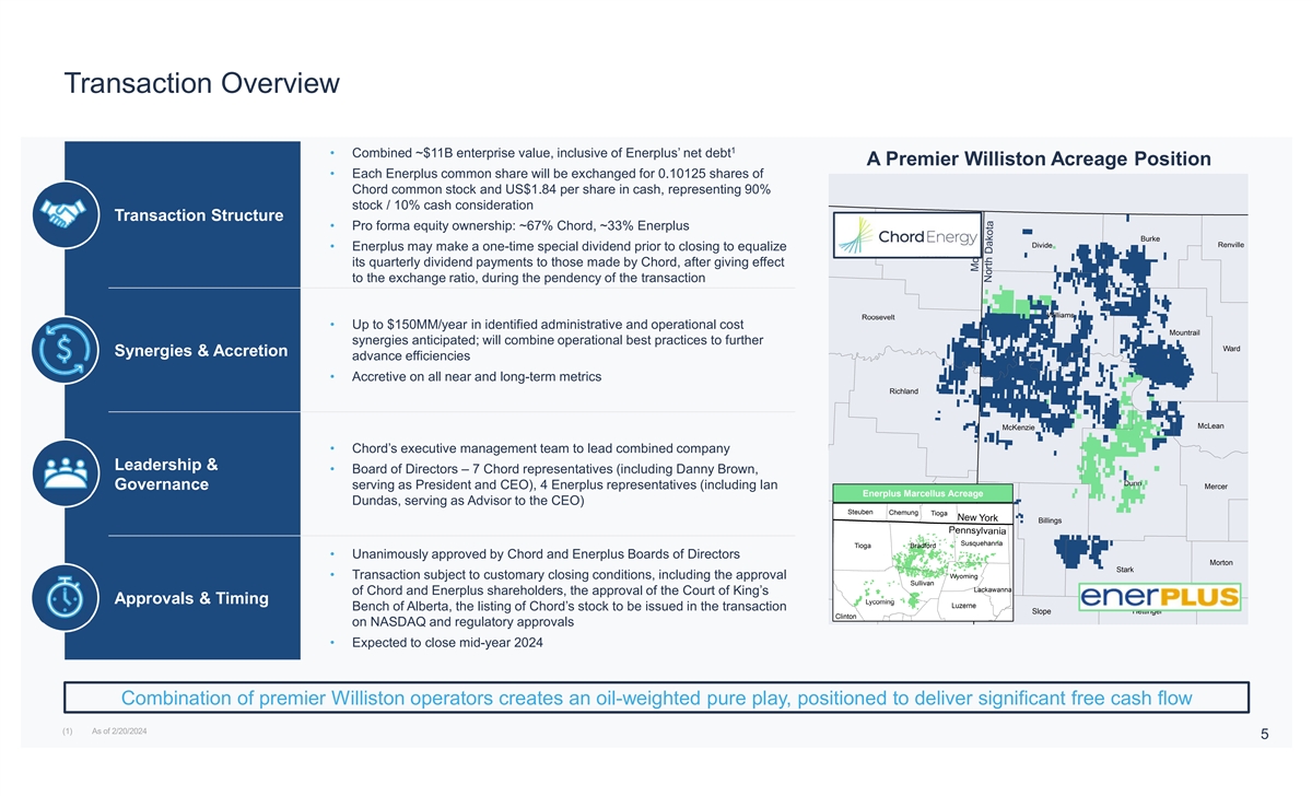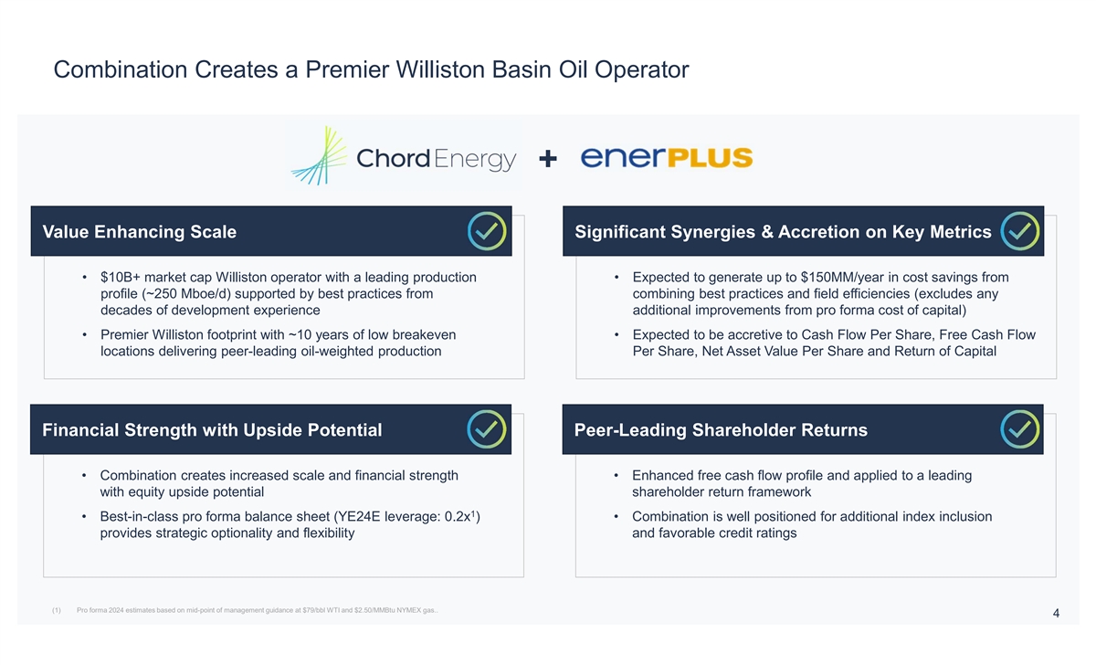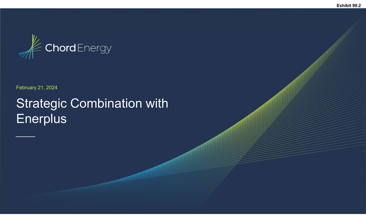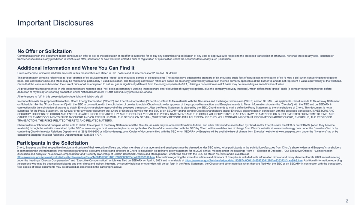 Important Disclosures No Offer or Solicitation Communications in this document do not constitute an offer to sell or the solicitation of an offer to subscribe for or buy any securities or a solicitation of any vote or approval with respect to the proposed transaction or otherwise, nor shall there be any sale, issuance or transfer of securities in any jurisdiction in which such offer, solicitation or sale would be unlawful prior to registration or qualification under the securities laws of any such jurisdiction. Additional Information and Where You Can Find It Unless otherwise indicated, all dollar amounts in this presentation are stated in U.S. dollars and all references to $ are to U.S. dollars. This presentation contains references to boe (barrels of oil equivalent) and Mboe (one thousand barrels of oil equivalent). The parties have adopted the standard of six thousand cubic feet of natural gas to one barrel of oil (6 Mcf: 1 bbl) when converting natural gas to boes. The conventions boe and Mboe may be misleading, particularly if used in isolation. The foregoing conversion ratios are based on an energy equivalency conversion method primarily applicable at the burner tip and do not represent a value equivalency at the wellhead. Given that the value ratio based on the current price of oil as compared to natural gas is significantly different from the energy equivalent of 6:1, utilizing a conversion on a 6:1 basis may be misleading as an indication of value. All production volumes presented in this presentation are reported on a net basis (a company's working interest share after deduction of royalty obligations, plus the company's royalty interests), which differs from gross basis (a company's working interest before deduction of royalties) for reporting production under National Instrument 51-101 and industry practice in Canada. All references to oil in this presentation include light and tight crude oil. In connection with the proposed transaction, Chord Energy Corporation (“Chord”) and Enerplus Corporation (“Enerplus”) intend to file materials with the Securities and Exchange Commission (“SEC”) and on SEDAR+, as applicable. Chord intends to file a Proxy Statement on Schedule 14A (the Proxy Statement ) with the SEC in connection with the solicitation of proxies to obtain Chord stockholder approval of the proposed transaction, and Enerplus intends to file an information circular (the “Circular”) with the TSX and on SEDAR+ in connection with the solicitation of proxies to obtain Enerplus shareholder approval of the proposed transaction. After the Proxy Statement is cleared by the SEC, Chord intends to mail a definitive Proxy Statement to the shareholders of Chord. This document is not a substitute for the Proxy Statement, the Circular or for any other document that Chord or Enerplus may file with the SEC or on SEDAR+ and/or send to Chord’s shareholders and/or Enerplus’ shareholders in connection with the proposed transaction. INVESTORS AND SECURITY HOLDERS OF CHORD AND ENERPLUS ARE URGED TO CAREFULLY AND THOROUGHLY READ THE PROXY STATEMENT AND THE CIRCULAR, RESPECTIVELY, AS EACH MAY BE AMENDED OR SUPPLEMENTED FROM TIME TO TIME, AND OTHER RELEVANT DOCUMENTS FILED BY CHORD AND/OR ENERPLUS WITH THE SEC OR ON SEDAR+, WHEN THEY BECOME AVAILABLE BECAUSE THEY WILL CONTAIN IMPORTANT INFORMATION ABOUT CHORD, ENERPLUS, THE PROPOSED TRANSACTION, THE RISKS RELATED THERETO AND RELATED MATTERS. Shareholders of Chord and Enerplus will be able to obtain free copies of the Proxy Statement and the Circular, as each may be amended from time to time, and other relevant documents filed by Chord and/or Enerplus with the SEC or on SEDAR+ (when they become available) through the website maintained by the SEC at www.sec.gov or at www.sedarplus.ca, as applicable. Copies of documents filed with the SEC by Chord will be available free of charge from Chord’s website at www.chordenergy.com under the “Investors” tab or by contacting Chord’s Investor Relations Department at (281) 404-9600 or ir@chordenergy.com. Copies of documents filed with the SEC or on SEDAR+ by Enerplus will be available free of charge from Enerplus’ website at www.enerplus.com under the “Investors” tab or by contacting Enerplus’ Investor Relations Department at (403) 298-1707. Participants in the Solicitation Chord, Enerplus and their respective directors and certain of their executive officers and other members of management and employees may be deemed, under SEC rules, to be participants in the solicitation of proxies from Chord’s shareholders and Enerplus’ shareholders in connection with the transaction. Information regarding the executive officers and directors of Chord is included in its definitive proxy statement for its 2023 annual meeting under the headings “Item 1 – Election of Directors”, “Our Executive Officers”, “Compensation Discussion and Analysis”, “Executive Compensation” and “Security Ownership of Certain Beneficial Owners and Management”, which was filed with the SEC on March 16, 2023 and is available at https://www.sec.gov/ixviewer/ix.html?doc=/Archives/edgar/data/1486159/000148615923000007/chrd-20230316.htm. Information regarding the executive officers and directors of Enerplus is included in its information circular and proxy statement for its 2023 annual meeting under the headings “Director Compensation” and “Executive Compensation”, which was filed on SEDAR+ on April 4, 2023 and is available at https://www.sec.gov/Archives/edgar/data/1126874/000110465923041270/tm235372d3_ex99-2.htm. Additional information regarding the persons who may be deemed participants and their direct and indirect interests, by security holdings or otherwise, will be set forth in the Proxy Statement, the Circular and other materials when they are filed with the SEC or on SEDAR+ in connection with the transaction. Free copies of these documents may be obtained as described in the parag
