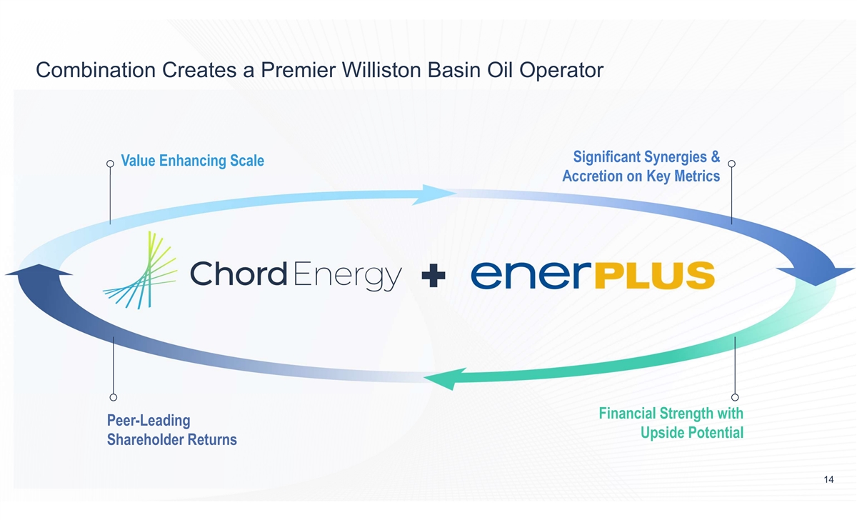 Combination Creates a Premier Williston Basin Oil Operator Significant and Resilient A Premier Williston Operator Enhances Position as with Top-TierAssets Free Cash Flow Generation Low-Cost Operator Enhances size and scale with high quality assets across ~1.3MM net acres and low Expected to generate up to breakeven inventory pricing ~$150MM/year in identified administrative Expected ~$1.2B of FCF in 2024 with a and operational / capital synergies while 2 combined reinvestment rate of ~51% Commitment to continuous improvement combining operational best practices to across its business, including its further advance efficiencies 1 environmental footprint Compelling Long Term Capital Returns Program to Maintains Best in Class Value Proposition Balance Sheet Deliver Significant Value Attractive valuation vs. new peer set results in compelling investment opportunity 2 Peer leading return-of-capital program YE24E Net Debt / EBITDA of 0.2x through base dividends, share buybacks All shareholders expected to immediately Strong financial capacity and variable dividends benefit from compelling pro forma metrics vs. peers Combination allows for significant shareholder value creation and equity upside (1) Please refer to Chord website (www.chordenergy.com) and Enerplus website (www.enerplus.com) for ESG disclosure and reporting. Enerplus published it latest ESG report in June 2023 13 (2) Pro forma 2024 estimates based on mid-point of management guidance at $79/bbl WTI and $2.50/MMBtu NYMEX gas..
