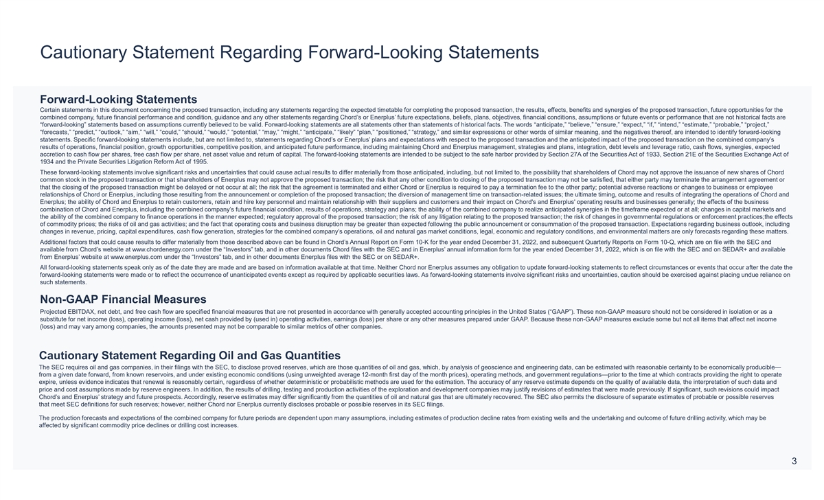 Cautionary Statement Regarding Forward-Looking Statements Forward-Looking Statements Certain statements in this document concerning the proposed transaction, including any statements regarding the expected timetable for completing the proposed transaction, the results, effects, benefits and synergies of the proposed transaction, future opportunities for the combined company, future financial performance and condition, guidance and any other statements regarding Chord’s or Enerplus’ future expectations, beliefs, plans, objectives, financial conditions, assumptions or future events or performance that are not historical facts are “forward-looking” statements based on assumptions currently believed to be valid. Forward-looking statements are all statements other than statements of historical facts. The words “anticipate,” “believe,” “ensure,” “expect,” “if,” “intend,” “estimate,” “probable,” “project,” “forecasts,” “predict,” “outlook,” “aim,” “will,” “could,” “should,” “would,” “potential,” “may,” “might,” “anticipate,” “likely” “plan,” “positioned,” “strategy,” and similar expressions or other words of similar meaning, and the negatives thereof, are intended to identify forward-looking statements. Specific forward-looking statements include, but are not limited to, statements regarding Chord’s or Enerplus’ plans and expectations with respect to the proposed transaction and the anticipated impact of the proposed transaction on the combined company’s results of operations, financial position, growth opportunities, competitive position, and anticipated future performance, including maintaining Chord and Enerplus management, strategies and plans, integration, debt levels and leverage ratio, cash flows, synergies, expected accretion to cash flow per shares, free cash flow per share, net asset value and return of capital. The forward-looking statements are intended to be subject to the safe harbor provided by Section 27A of the Securities Act of 1933, Section 21E of the Securities Exchange Act of 1934 and the Private Securities Litigation Reform Act of 1995. These forward-looking statements involve significant risks and uncertainties that could cause actual results to differ materially from those anticipated, including, but not limited to, the possibility that shareholders of Chord may not approve the issuance of new shares of Chord common stock in the proposed transaction or that shareholders of Enerplus may not approve the proposed transaction; the risk that any other condition to closing of the proposed transaction may not be satisfied, that either party may terminate the arrangement agreement or that the closing of the proposed transaction might be delayed or not occur at all; the risk that the agreement is terminated and either Chord or Enerplus is required to pay a termination fee to the other party; potential adverse reactions or changes to business or employee relationships of Chord or Enerplus, including those resulting from the announcement or completion of the proposed transaction; the diversion of management time on transaction-related issues; the ultimate timing, outcome and results of integrating the operations of Chord and Enerplus; the ability of Chord and Enerplus to retain customers, retain and hire key personnel and maintain relationship with their suppliers and customers and their impact on Chord's and Enerplus' operating results and businesses generally; the effects of the business combination of Chord and Enerplus, including the combined company’s future financial condition, results of operations, strategy and plans; the ability of the combined company to realize anticipated synergies in the timeframe expected or at all; changes in capital markets and the ability of the combined company to finance operations in the manner expected; regulatory approval of the proposed transaction; the risk of any litigation relating to the proposed transaction; the risk of changes in governmental regulations or enforcement practices;the effects of commodity prices; the risks of oil and gas activities; and the fact that operating costs and business disruption may be greater than expected following the public announcement or consummation of the proposed transaction. Expectations regarding business outlook, including changes in revenue, pricing, capital expenditures, cash flow generation, strategies for the combined company’s operations, oil and natural gas market conditions, legal, economic and regulatory conditions, and environmental matters are only forecasts regarding these matters. Additional factors that could cause results to differ materially from those described above can be found in Chord’s Annual Report on Form 10-K for the year ended December 31, 2022, and subsequent Quarterly Reports on Form 10-Q, which are on file with the SEC and available from Chord’s website at www.chordenergy.com under the “Investors” tab, and in other documents Chord files with the SEC and in Enerplus’ annual information form for the year ended December 31, 2022, which is on file with the SEC and on SEDAR+ and available from Enerplus’ website at www.enerplus.com under the “Investors” tab, and in other documents Enerplus files with the SEC or on SEDAR+. All forward-looking statements speak only as of the date they are made and are based on information available at that time. Neither Chord nor Enerplus assumes any obligation to update forward-looking statements to reflect circumstances or events that occur after the date the forward-looking statements were made or to reflect the occurrence of unanticipated events except as required by applicable securities laws. As forward-looking statements involve significant risks and uncertainties, caution should be exercised against placing undue reliance on such statements. Non-GAAP Financial Measures Projected EBITDAX, net debt, and free 