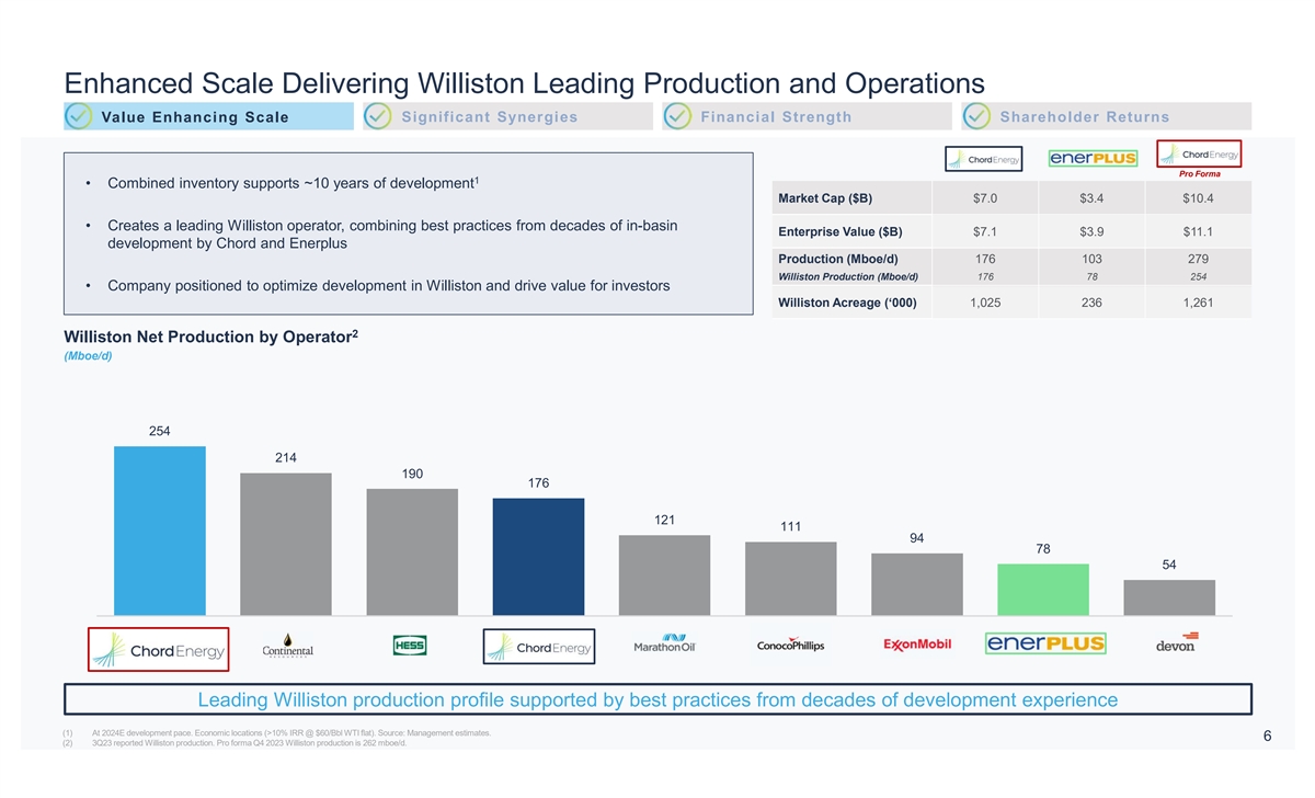 Transaction Overview 1 • Combined ~$11B enterprise value, inclusive of Enerplus’ net debt A Premier Williston Acreage Position • Each Enerplus common share will be exchanged for 0.10125 shares of Chord common stock and US$1.84 per share in cash, representing 90% stock / 10% cash consideration Transaction Structure • Pro forma equity ownership: ~67% Chord, ~33% Enerplus • Enerplus may make a one-time special dividend prior to closing to equalize its quarterly dividend payments to those made by Chord, after giving effect to the exchange ratio, during the pendency of the transaction • Up to $150MM/year in identified administrative and operational cost synergies anticipated; will combine operational best practices to further Synergies & Accretion advance efficiencies • Accretive on all near and long-term metrics • Chord’s executive management team to lead combined company Leadership & • Board of Directors – 7 Chord representatives (including Danny Brown, serving as President and CEO), 4 Enerplus representatives (including Ian Governance Enerplus Marcellus Acreage Dundas, serving as Advisor to the CEO) • Unanimously approved by Chord and Enerplus Boards of Directors • Transaction subject to customary closing conditions, including the approval of Chord and Enerplus shareholders, the approval of the Court of King’s Approvals & Timing Bench of Alberta, the listing of Chord’s stock to be issued in the transaction on NASDAQ and regulatory approvals • Expected to close mid-year 2024 Combination of premier Williston operators creates an oil-weighted pure play, positioned to deliver significant free cash flow (1) As of 2/20/2024 5
