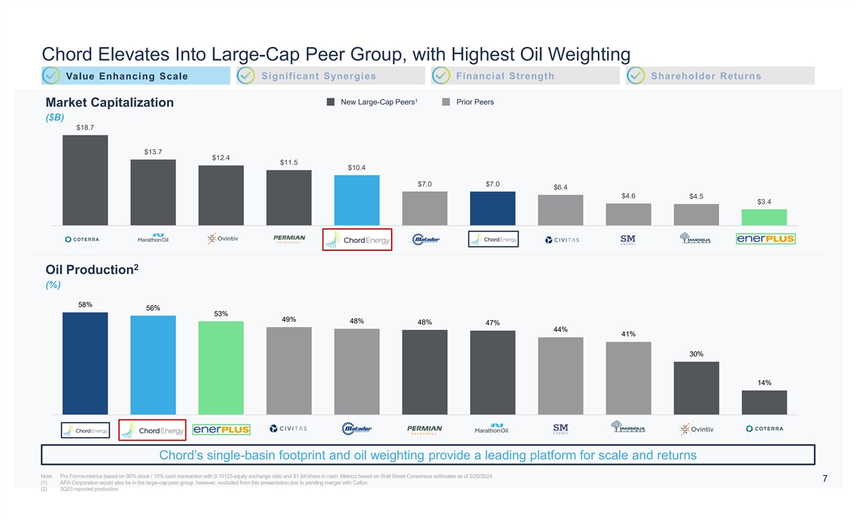 Enhanced Scale Delivering Williston Leading Production and Operations Value Enhancing Scale Significant Synergies Financial Strength Shareholder Returns Pro Forma 1 • Combined inventory supports ~10 years of development Market Cap ($B) $7.0 $3.4 $10.4 • Creates a leading Williston operator, combining best practices from decades of in-basin Enterprise Value ($B) $7.1 $3.9 $11.1 development by Chord and Enerplus Production (Mboe/d) 176 103 279 Williston Production (Mboe/d) 176 78 254 • Company positioned to optimize development in Williston and drive value for investors Williston Acreage (‘000) 1,025 236 1,261 2 Williston Net Production by Operator (Mboe/d) 254 214 190 176 121 111 94 78 54 Leading Williston production profile supported by best practices from decades of development experience (1) At 2024E development pace. Economic locations (>10% IRR @ $60/Bbl WTI flat). Source: Management estimates. 6 (2) 3Q23 reported Williston production. Pro forma Q4 2023 Williston production is 262 mboe/d.