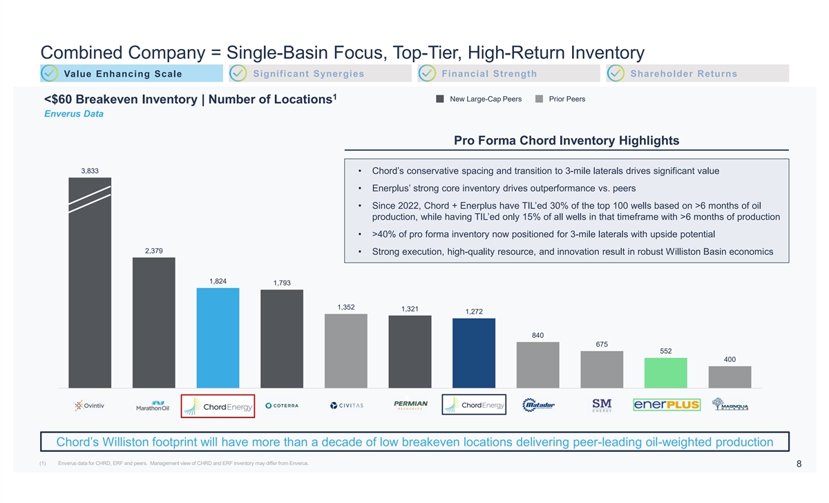 Chord Elevates Into Large-Cap Peer Group, with Highest Oil Weighting Value Enhancing Scale Significant Synergies Financial Strength Shareholder Returns 1 New Large-Cap Peers Prior Peers Market Capitalization ($B) $18.7 $13.7 $12.4 $11.5 $10.4 $7.0 $7.0 $6.4 $4.6 $4.5 $3.4 CTRA MRO OVV PR PF CHRD + ERF MTDR CHRD CIVI SM MGY ERF 2 Oil Production (%) 58% 56% 53% 49% 48% 48% 47% 44% 41% 30% 14% CHRD PF CHRD + ERF ERF CIVI MTDR PR MRO SM MGY OVV CTRA ♦ Chord’s single-basin footprint and oil weighting provide a leading platform for scale and returns Note: Pro Forma metrics based on 90% stock / 10% cash transaction with 0.10125 equity exchange ratio and $1.84/share in cash. Metrics based on Wall Street Consensus estimates as of 2/20/2024. 7 (1) APA Corporation would also be in the large-cap peer group, however, excluded from this presentation due to pending merger with Callon. (2) 3Q23 reported production.