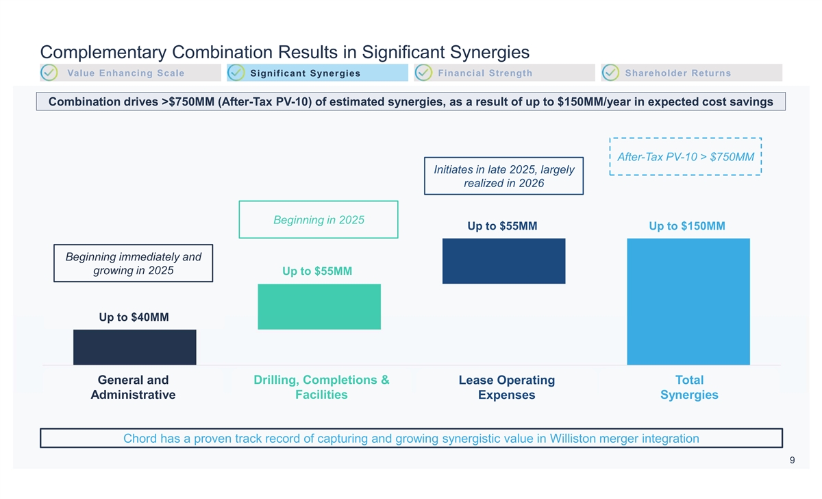 Combined Company = Single-Basin Focus, Top-Tier, High-Return Inventory Value Enhancing Scale Significant Synergies Financial Strength Shareholder Returns 1 New Large-Cap Peers Prior Peers <$60 Breakeven Inventory | Number of Locations Enverus Data Pro Forma Chord Inventory Highlights 3,833 • Chord’s conservative spacing and transition to 3-mile laterals drives significant value • Enerplus’ strong core inventory drives outperformance vs. peers • Since 2022, Chord + Enerplus have TIL’ed 30% of the top 100 wells based on >6 months of oil production, while having TIL’ed only 15% of all wells in that timeframe with >6 months of production • >40% of pro forma inventory now positioned for 3-mile laterals with upside potential 2,379 • Strong execution, high-quality resource, and innovation result in robust Williston Basin economics 1,824 1,793 1,352 1,321 1,272 840 675 552 400 OVV MRO Pro Forma CTRA CIVI PR CHRD MTDR SM ERF MGY ♦ Chord’s Williston footprint will have more than a decade of low breakeven locations delivering peer-leading oil-weighted production (1) Enverus data for CHRD, ERF and peers. Management view of CHRD and ERF inventory may differ from Enverus. 8